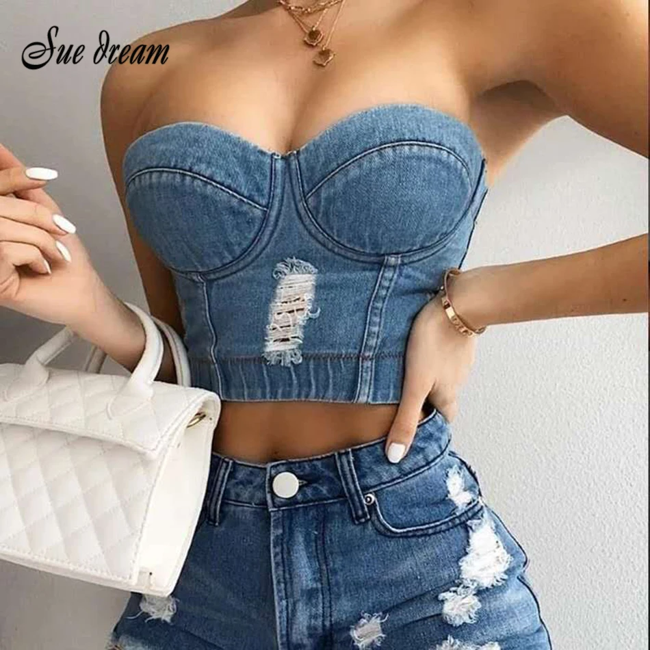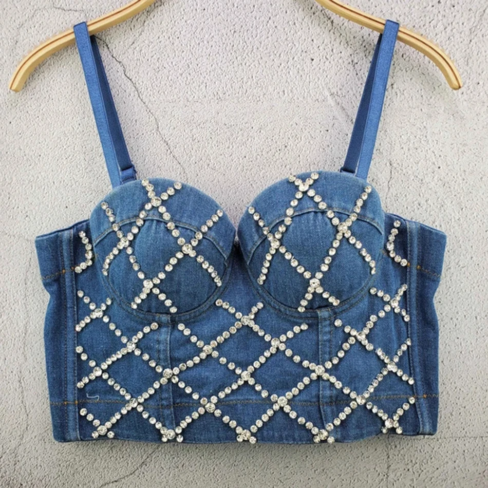 Джинсовый женский топ-бюстье пуш-ап, на тонких бретельках, со стразами, с эффектом потертости, 2021