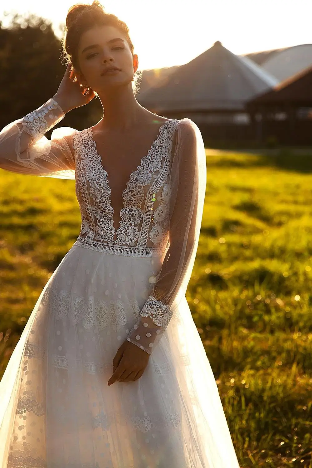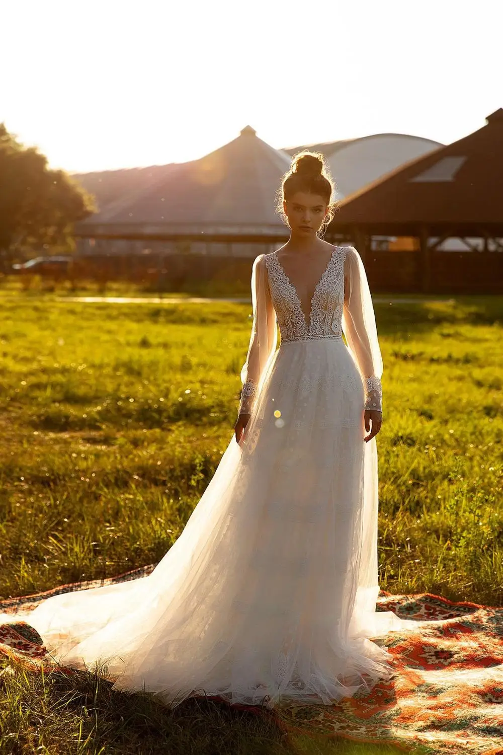 Свадебное платье с V-образным вырезом, длинными рукавами, кружевными аппликациями, с открытой спиной, трапециевидной формы, на заказ, 2021