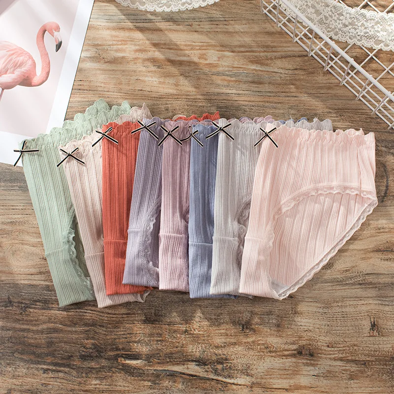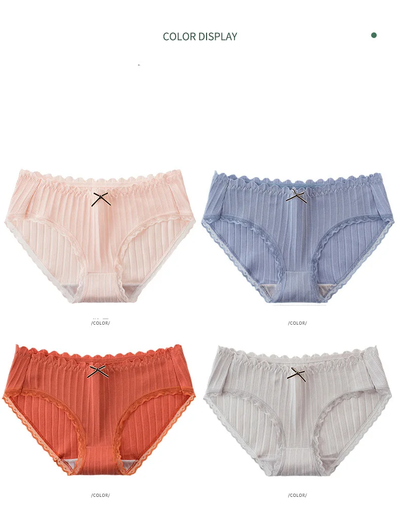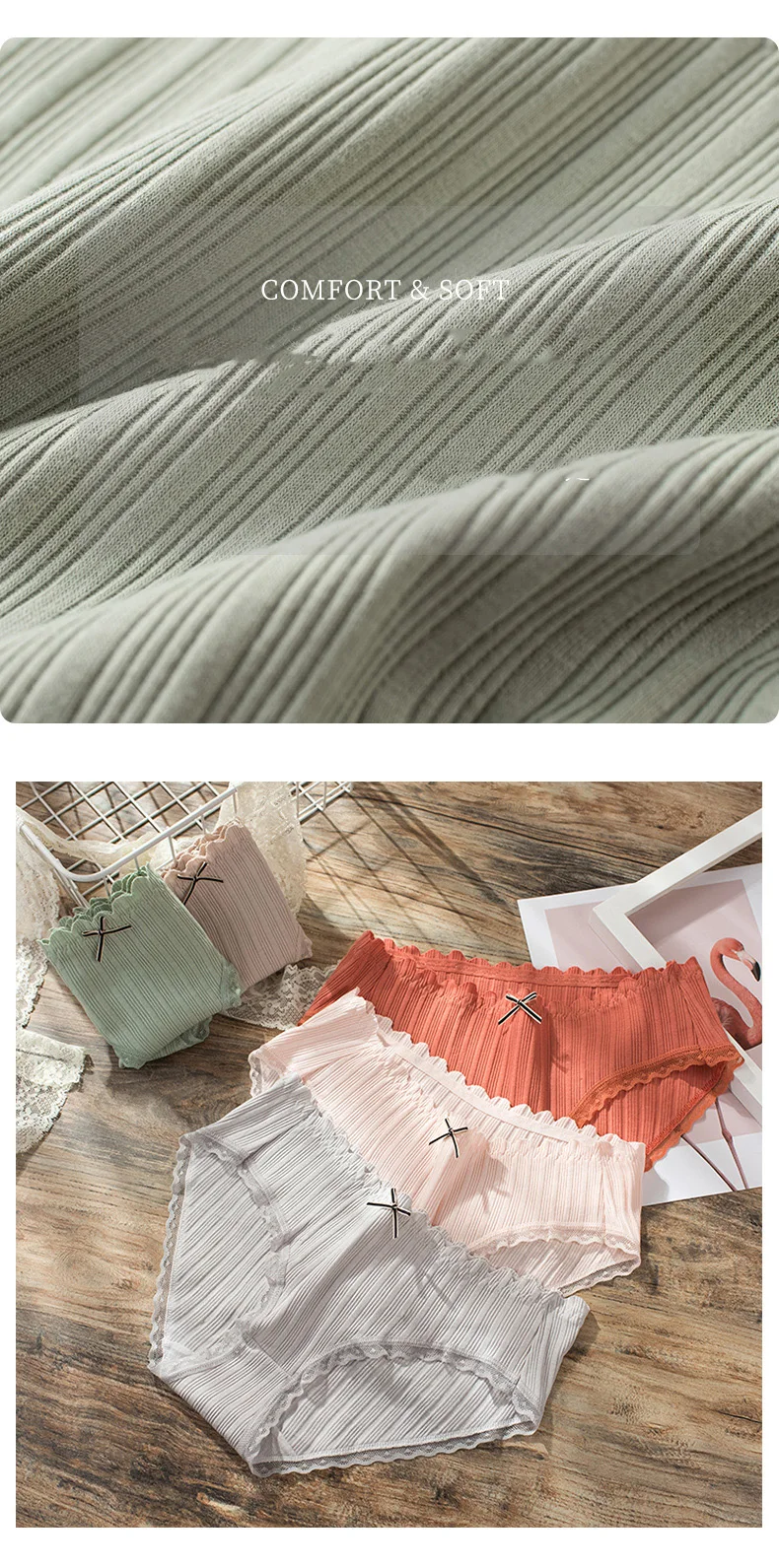 Женские хлопковые трусы с бантом, Однотонные трусы в полоску, кружевное нижнее белье со средней посадкой, дышащие трусы с оборками