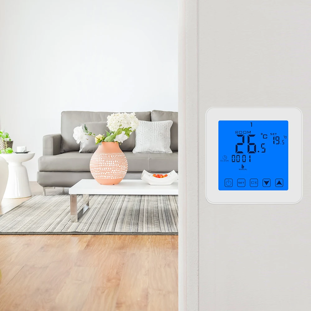 Термостат котла поддерживает отображение времени и слабого в реальном времени, сообщая вам удобное время. Нагревательный термостат с датчиком температуры воздуха также покажет вам комнатную температуру и температуру в то же время для удобства работы.