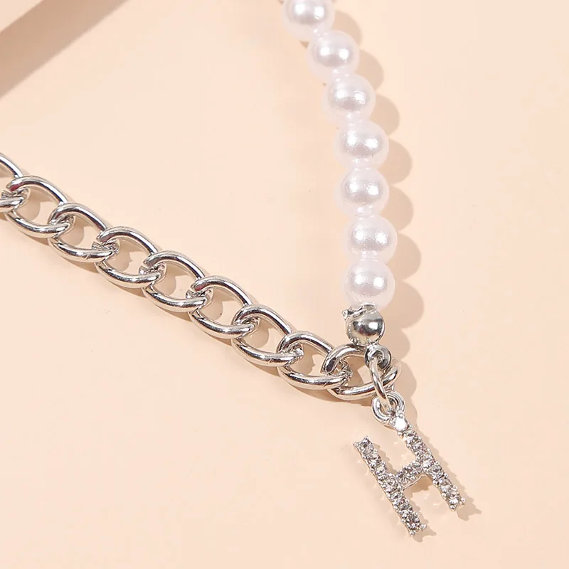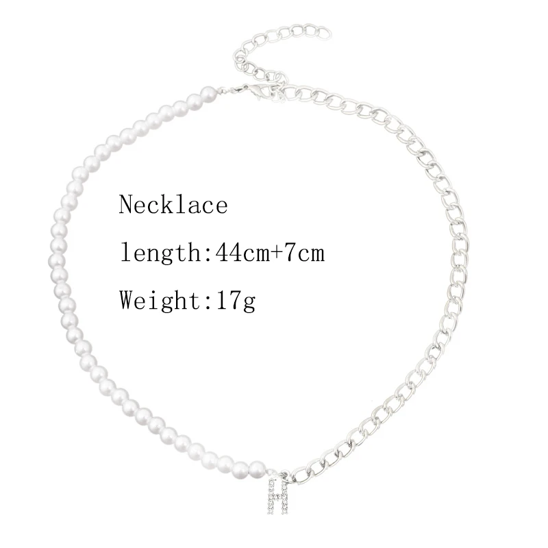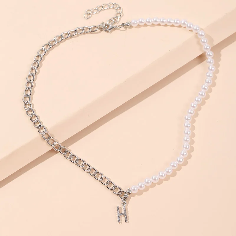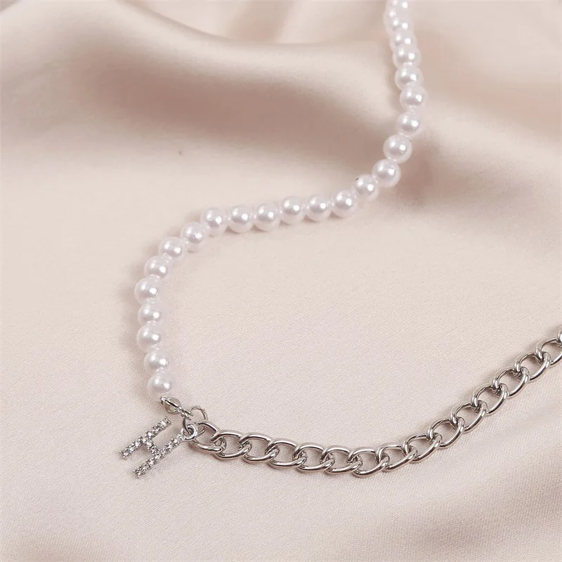 Ожерелье женское асимметричное, модная цепочка из белого жемчуга и звеньев серебра, модное колье с буквой H Стразы