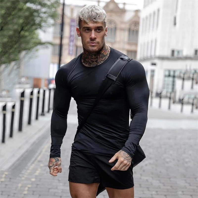 Мужская футболка для фитнеса в тренажерном зале, компрессионная облегающая футболка для бодибилдинга, футболка с длинным рукавом на осень, Спортивная футболка для тренировок, брендовая одежда