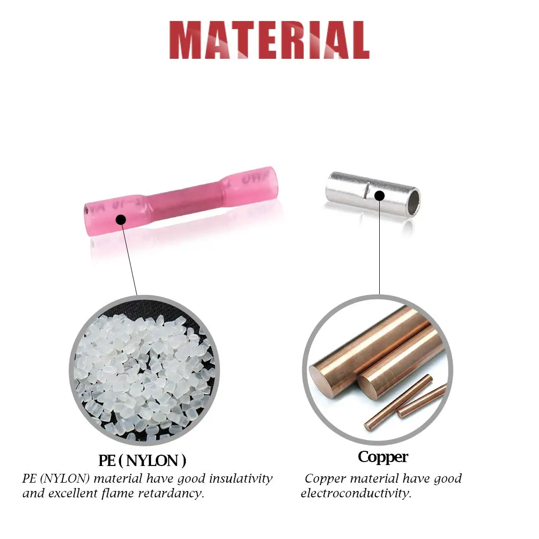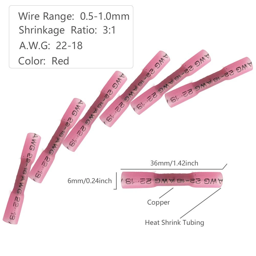 Термоусадочные обжимные клеммы, 100 шт., 22-16 AWG, водонепроницаемые полностью изолированные стыковые соединители для электрических проводов, набор в ассортименте, красный
