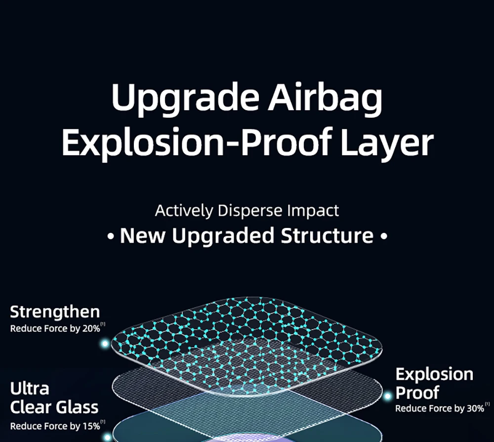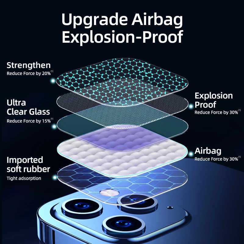 Новая модернизированная структура. 1. Укрепление -- уменьшение силы на 20% ''2. Прозрачное стекло Ultera-уменьшает силу на 30% 3. Взрывозащищенный -- уменьшает силу на 30% 4. Мягкая резина-плотная Адсорбция 5. Подушка безопасности-уменьшает силу на 30%