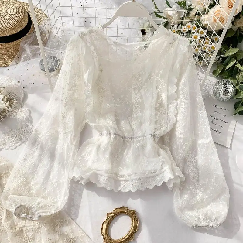Новые женские кружевные футболки; Сезон весна-осень; Модные тонкие длинные рукава короткие блузки женские пляжные Топы