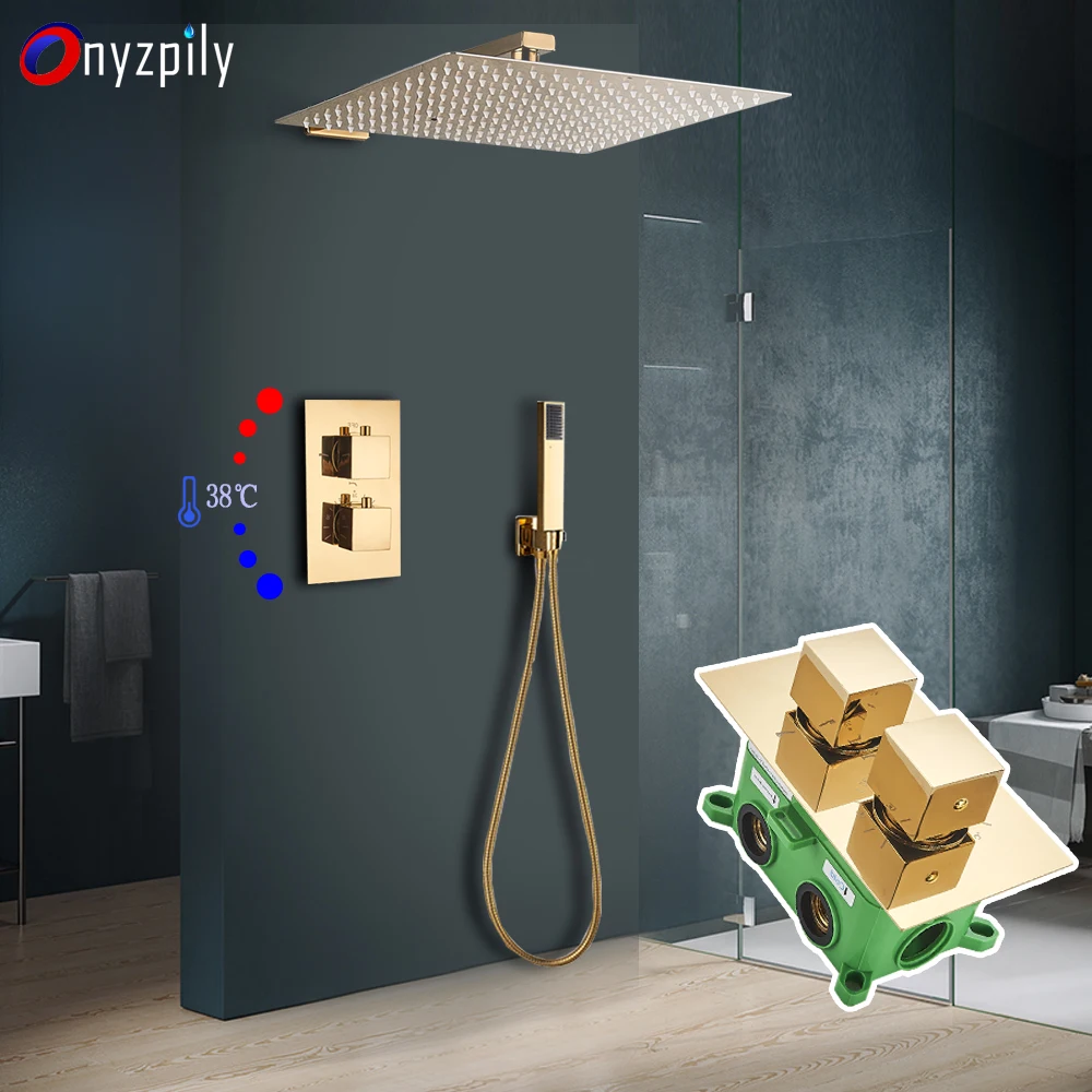 Смеситель для душа Onyzpily, Золотая насадка для душа из нержавеющей стали, настенное крепление с ручным душем, смеситель для душа для ванной комнаты, кран для водыКоличество ручек: одна ручкаМатериал сердечника клапана: керамикаТип: фиксированный вращающийсяТип/горячая водаТип управления: один держатель с двойным управлениемОсобенность: холодный и горячийСтиль: СовременныйОтделка поверхности: золотоОбработка поверхности: золотоМатериал насадки для душа: нержавеющая стальКлапан: Керамический клапанГорячая и холодная вода: смесительСветодиодный смеситель для душа: нетТип установки: настенное креплениеРазмер: 8/10/12 дюйма насадка для душа