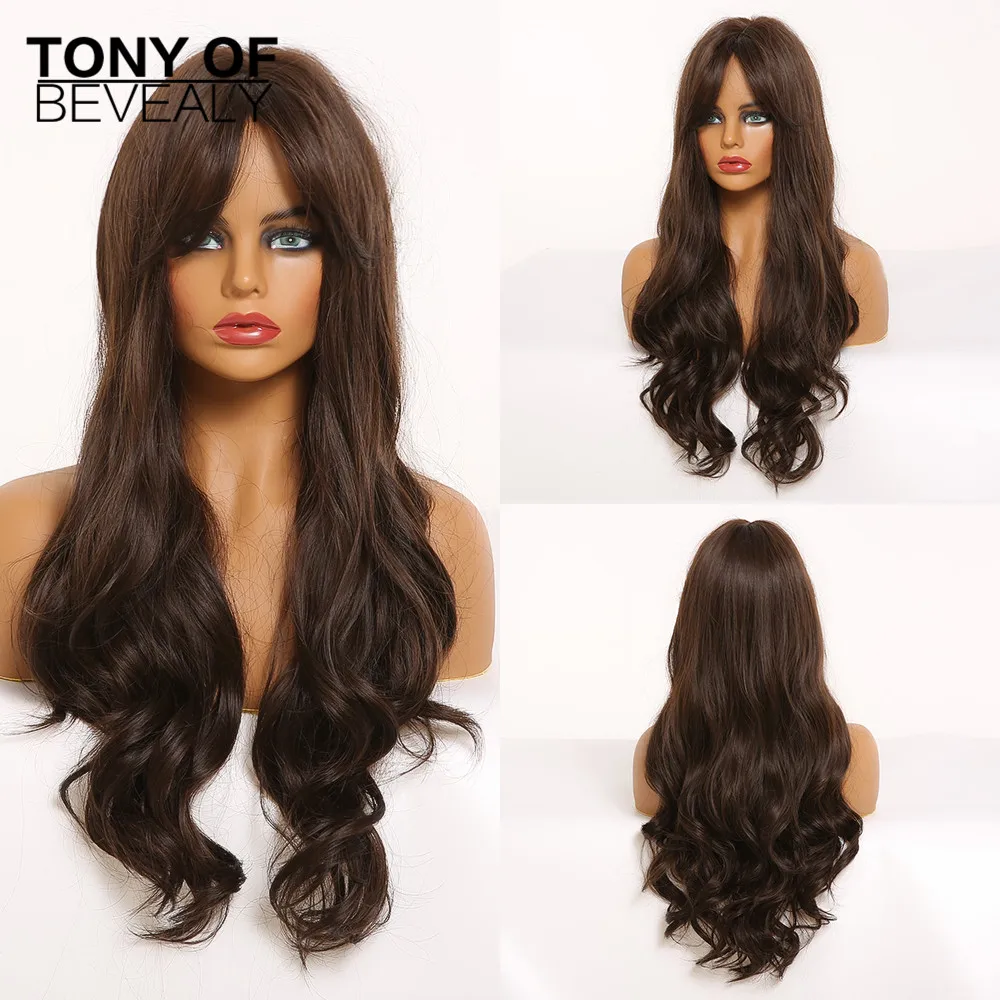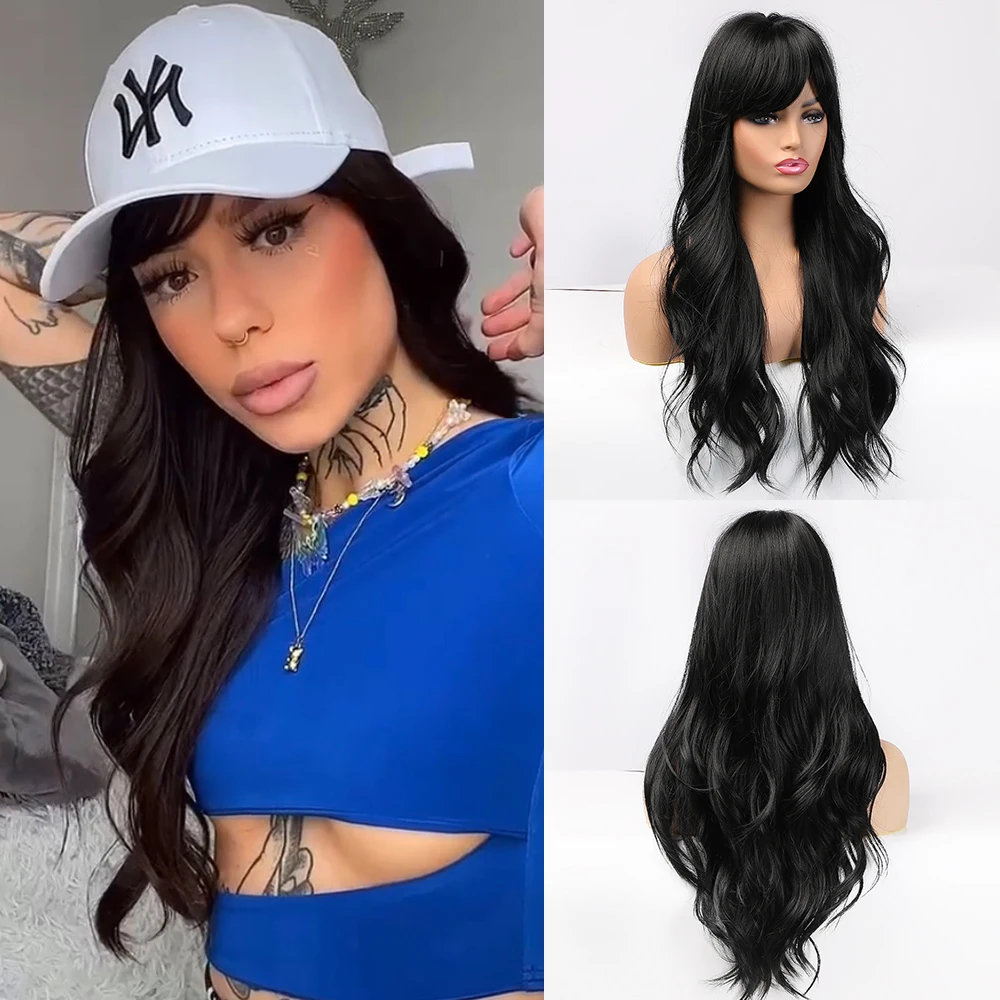 Длинные черные синтетические волосы, парики с челкой для женщин афро, натуральные волнистые ежедневные Косплей натуральные парики, термостойкие волоконные парики