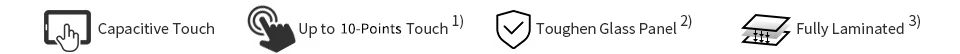 1) до 10 точек касания, в зависимости от операционной системы. 2) до 6H Твердость Закаленное стекло панели. 3) полностью ламинированный экран, лучший опыт отображения, защита от пыли.
