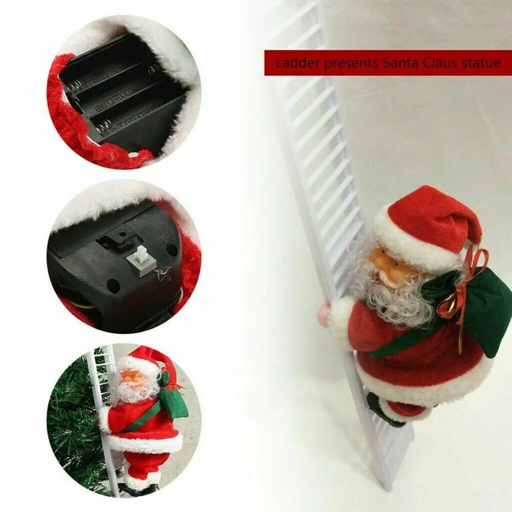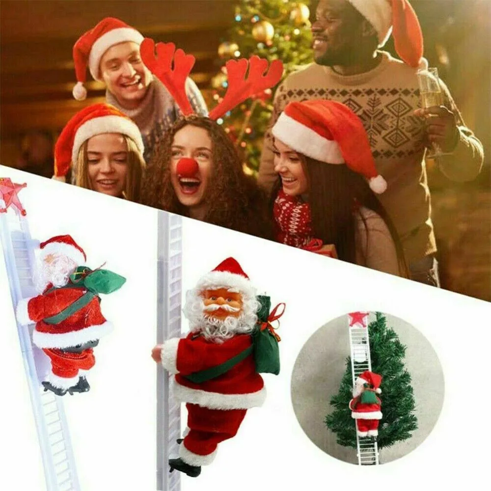❤【Уникальный и креативный 】 Электрический анимированный скалолазающий Санта-Клаус может подниметь вверх по лестницы и снова спускаться с музыкой, надев веселое лицо с мини-мешком на спине.
