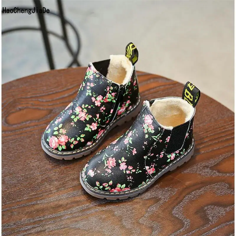 Новые модные детские зимние сапоги; Теплые плюшевые зимние качественные хлопковые сапоги с цветочным принтом; Детская обувь с толстым мехом внутри на мягкой подошве