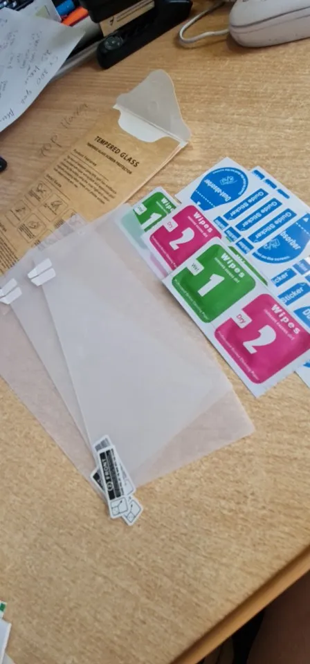 Заказ пришёл за 2,5 недели. К сожалению продавец решил положить вместо матовой плёнки глянцевую Anti Blue-Rey, хотя я заказала 1 матовую и 2 анти блю рей, к тому же в комплект не положили разглаживалку для плёнки, как хочешь, так и клей, хотя заказываю уже не первый раз. Извиняюсь за качество фото, но приложение обновили так, что не найти фото с телефона, пришлось фоткать на камеру приложения. Когда смотришь в торец плёнки, видно, что все три шт синие.