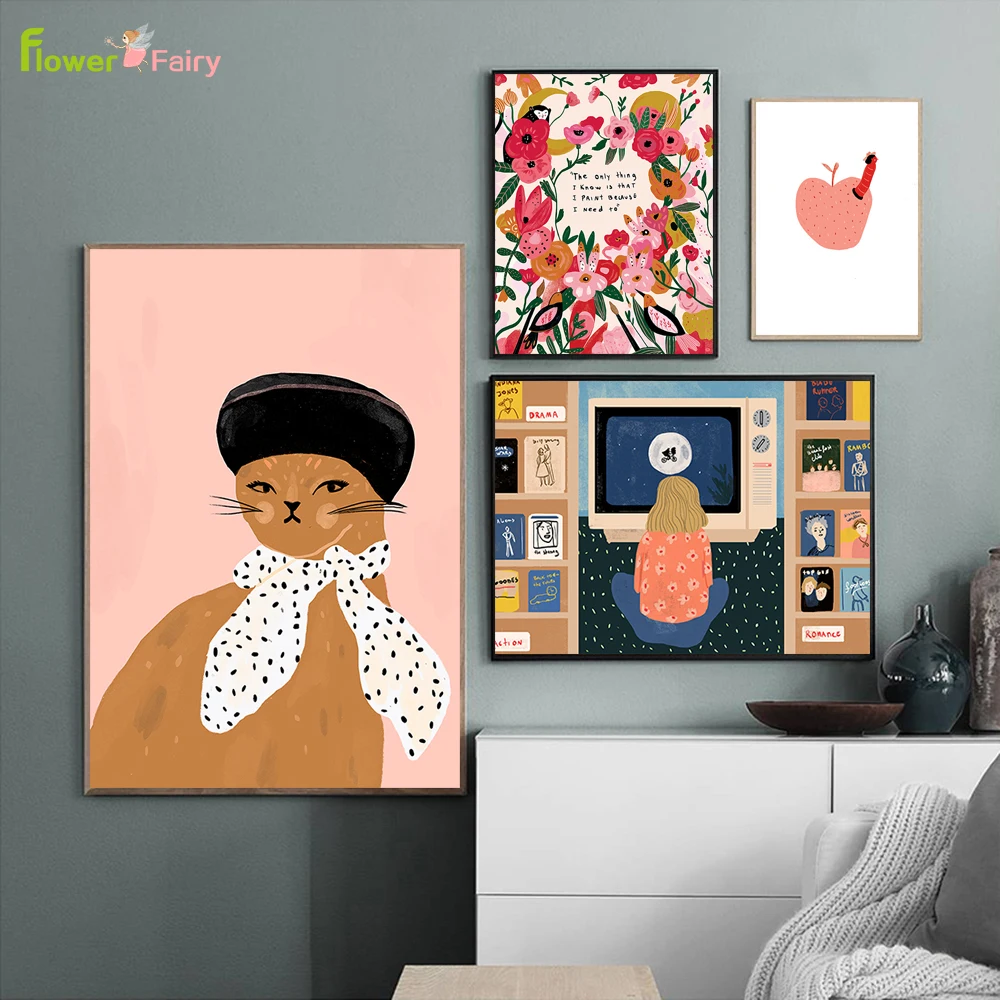 Мультяшные школьницы с кошкой, настенная Картина на холсте, иллюстрация, скандинавский постер, настенные картины для гостиной без рамки
