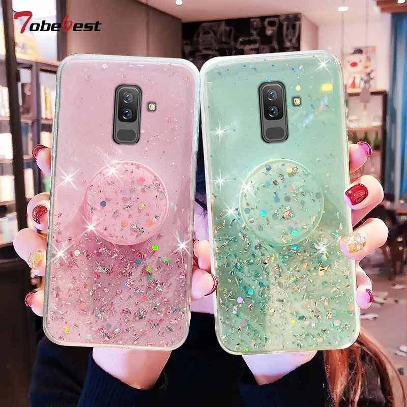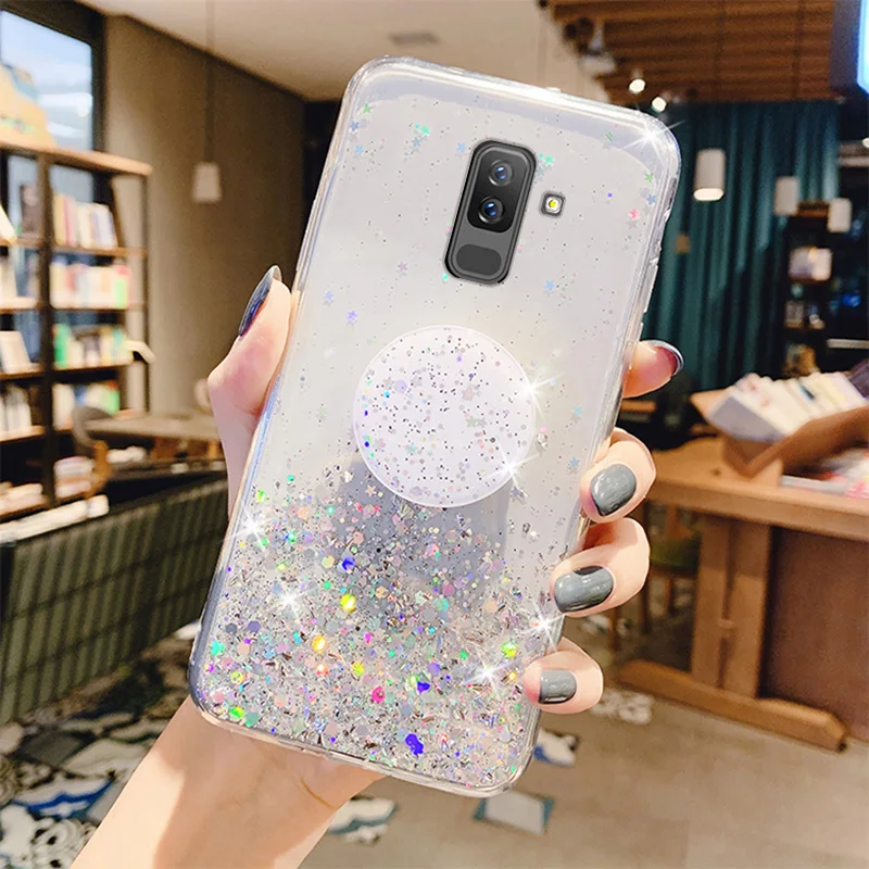 Чехол-держатель для телефона из серебристой фольги для Samsung Galaxy A6, A8 Plus 2018, мягкий силиконовый чехол-подставка с блестками