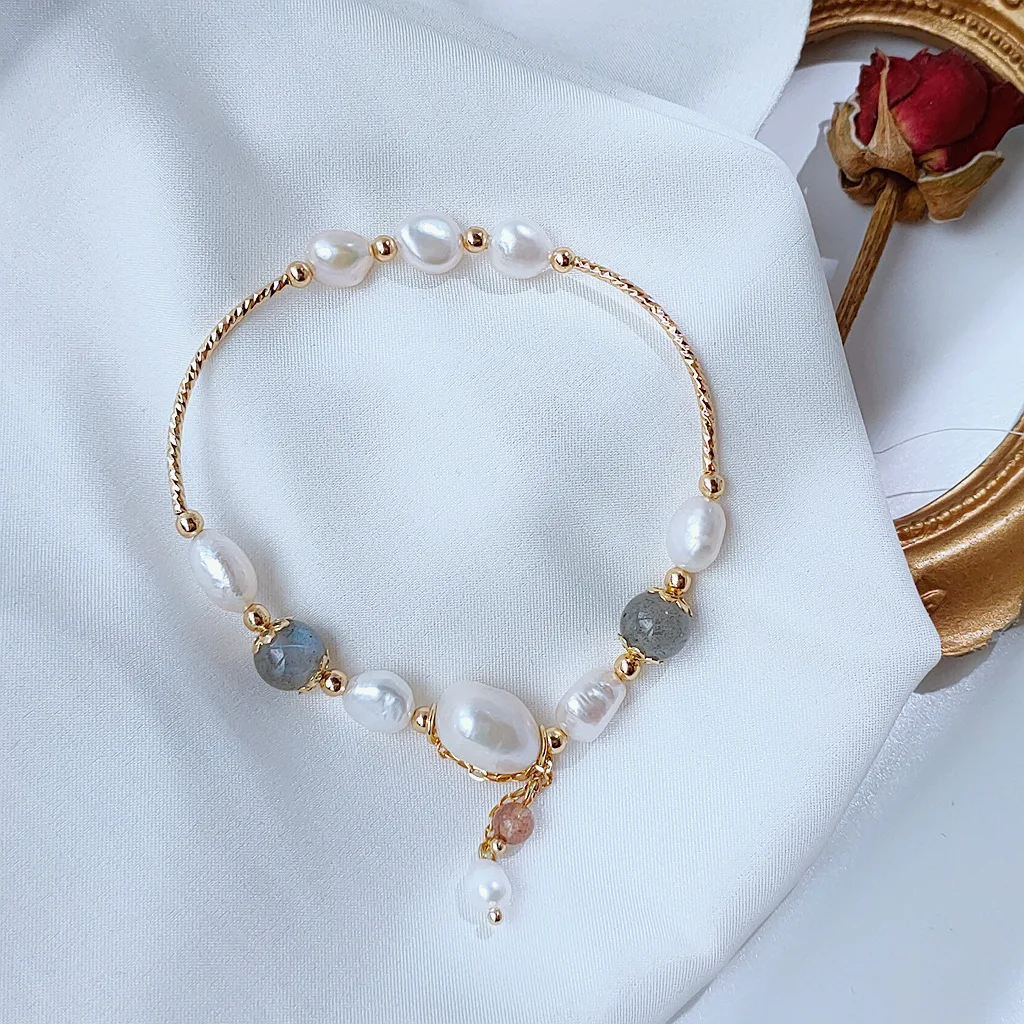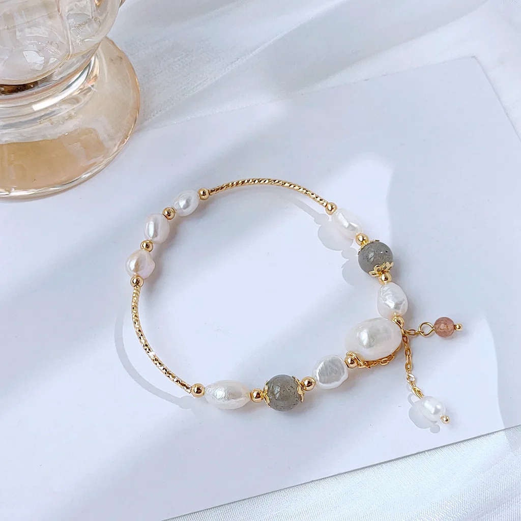 Женский браслет из 14-каратного золота, с натуральным пресноводным покрытием в стиле барокко, с жемчугом и лунным камнем
