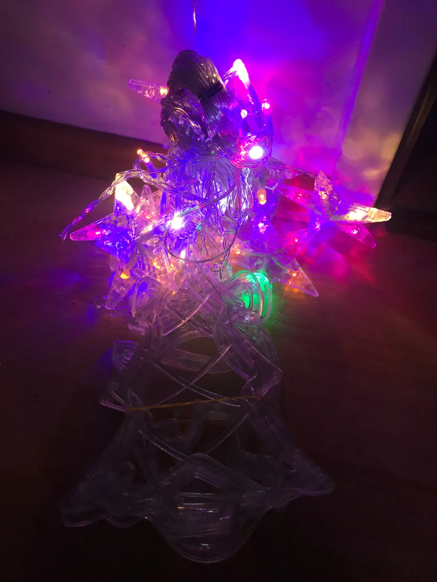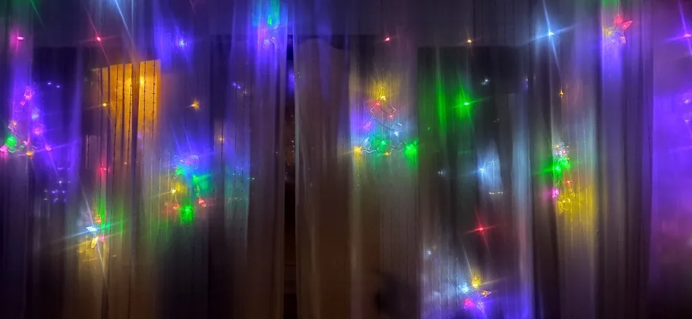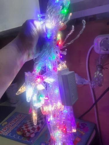 Очень навязчивая гирлянда, выглядит цвет не так как на картинке. Огоньки не сереневые, а rgb. Крупные нижние украшения.