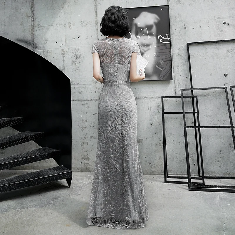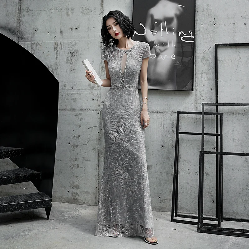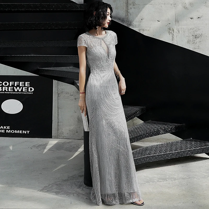 Серые Вечерние платья с круглым вырезом, ТРАПЕЦИЕВИДНОЕ ПЛАТЬЕ до пола с коротким рукавом, Новое кружевное платье с бусинами, большие размеры, индивидуальное женское официальное платье A174
