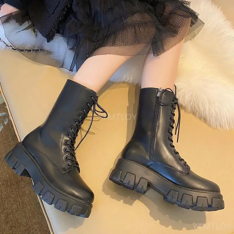 Женские кожаные ботинки на платформе, черные боевые ботинки до середины икры в готическом стиле, с перекрестной шнуровкой, на квадратном каблуке, весна-осень 2020