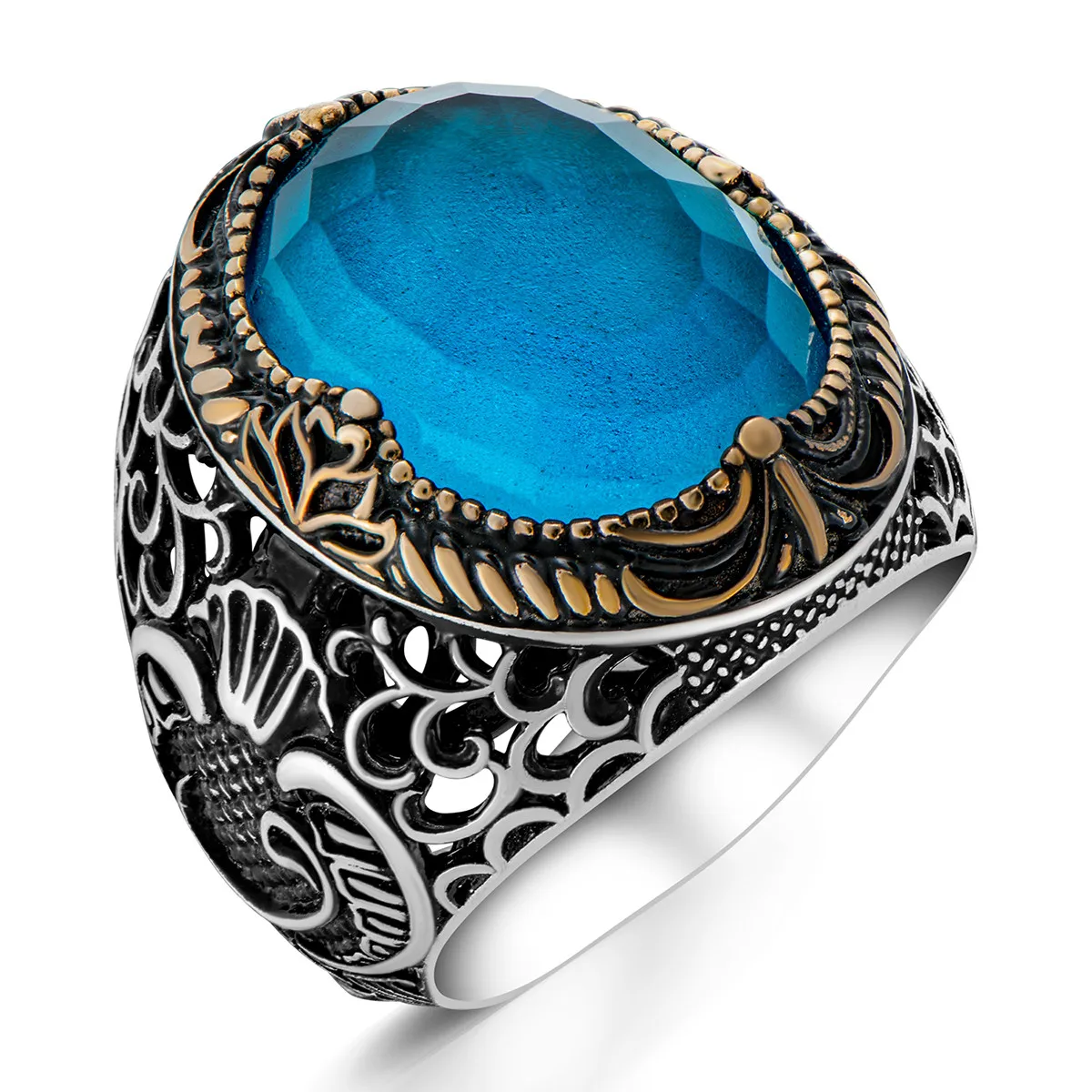 Мужское кольцо из серебра 925 пробы с аквакамнем и арабской буквой