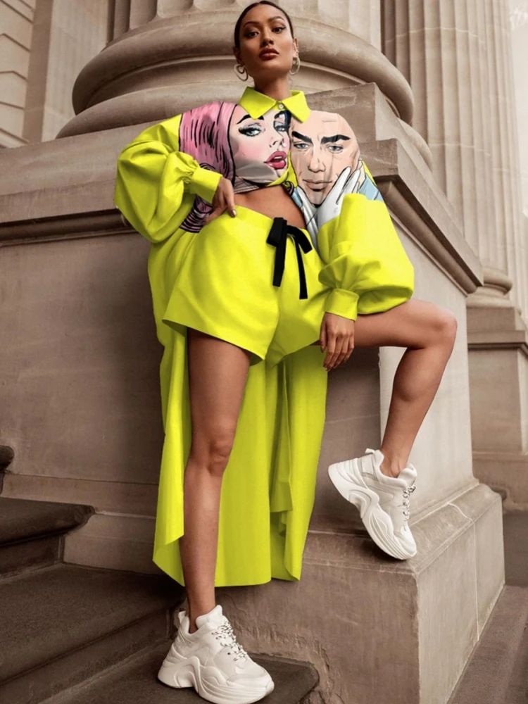 Женский комплект из 2 предметов, блузка с мультяшным принтом, длинная рубашка и шорты, спортивный костюм, весна-осень 2021