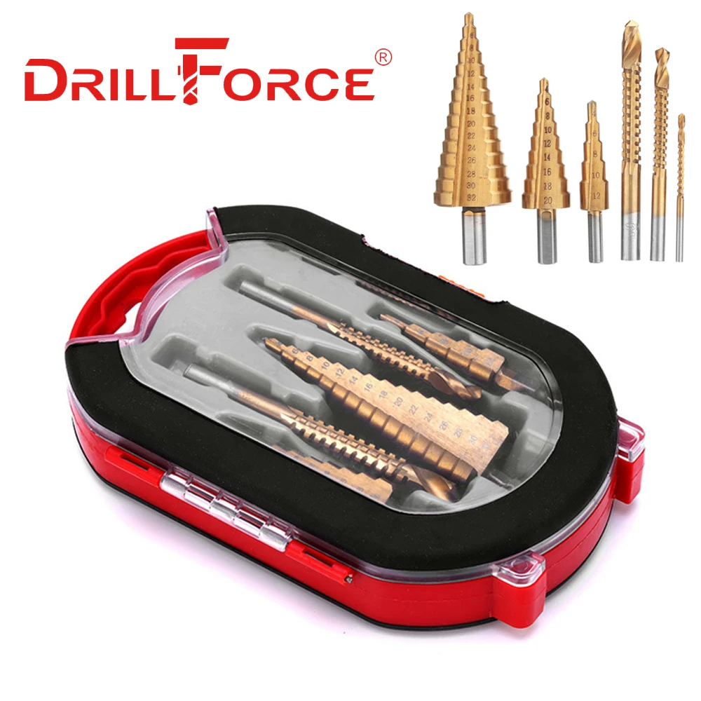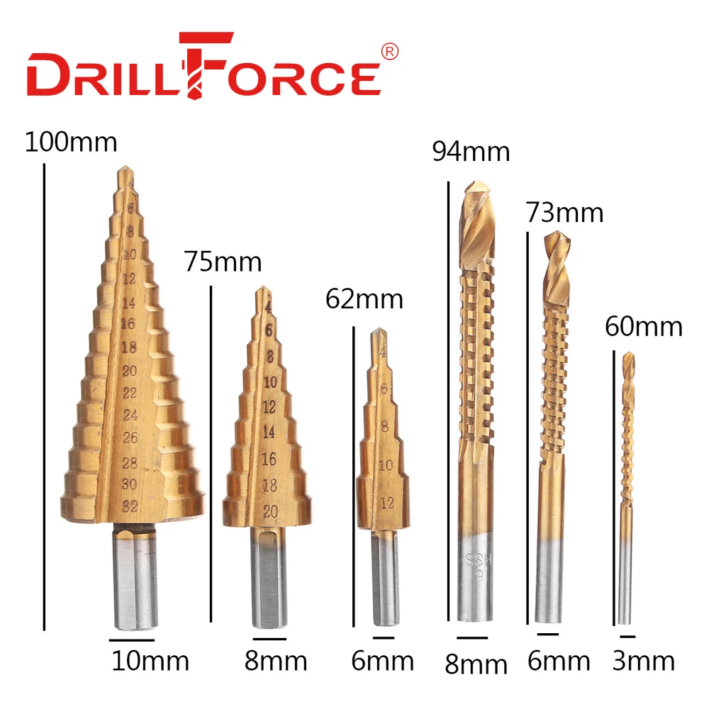 Набор сверл из быстрорежущей стали титана, 6 шт., биты по металлу для инструмента для сверления отверстий по дереву, конусный инструмент для корончатого, + 3,6,8 пильных насадок, 4-122032 мм