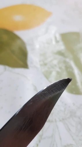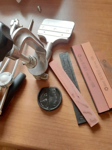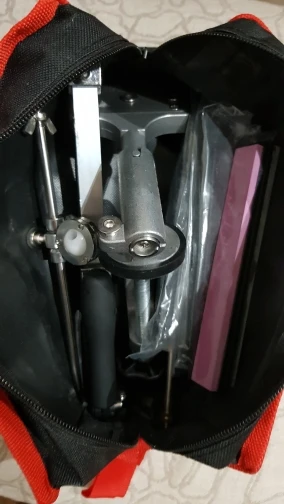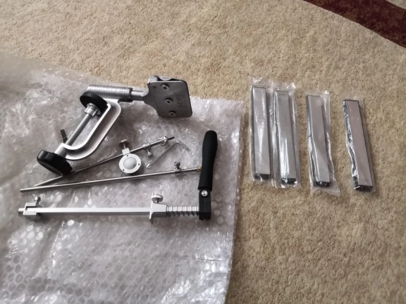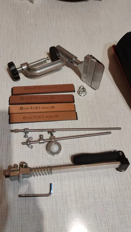 Брал только с алмазными камнями и два для полировки. Точилка не люфтит, некоторые крепления приходится подтягивать пассатижами, но в будущем можно сменить винт на барашек, круглый тяжело удержать. В процессе заточки угол не сбился, проверял приложением на телефоне. Для пробы взял старый кухонный нож, который наверное старше меня. Ни о какой режущей кромке речи не идёт. Нож абсолютно круглый. Начал с 600 камня и градацией довел до 5000 серым. Результат на фото. Блестящая кромка (режущая часть). Кончик ножа не точил, соответственно там видно как кромка исчезает. Все аккуратно складывается в сумку. Кдинственное камни бы убрать в мешочек, чтобы не побить. Для транспортировки продавец пупырки не пожалел, хоть в футбол играй. Перед применением советую ознакомиться с инструкцией, либо нагуглить как правильно точить на такой точилке. На Ютубе очень много профанов, которые точат словно болт напильником. В инструкции приложенной к точилке все отлично расписано, единственное все на английском яз