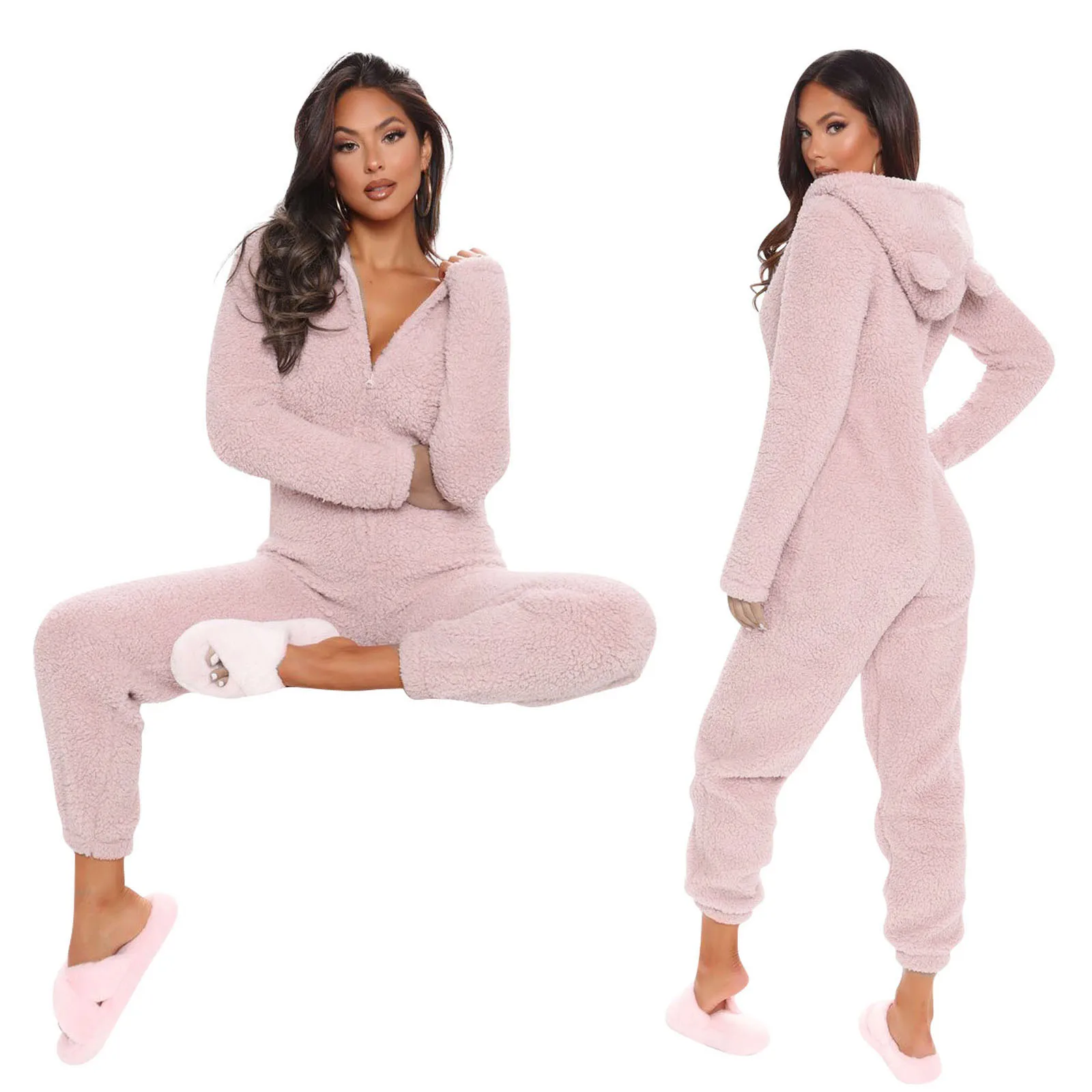 2020 зимняя теплая Пижама для женщин милые пушистые флисовые комбинезоны, одежда для сна, комбинезон размера плюс с капюшоном One piece Пижама для взрослых