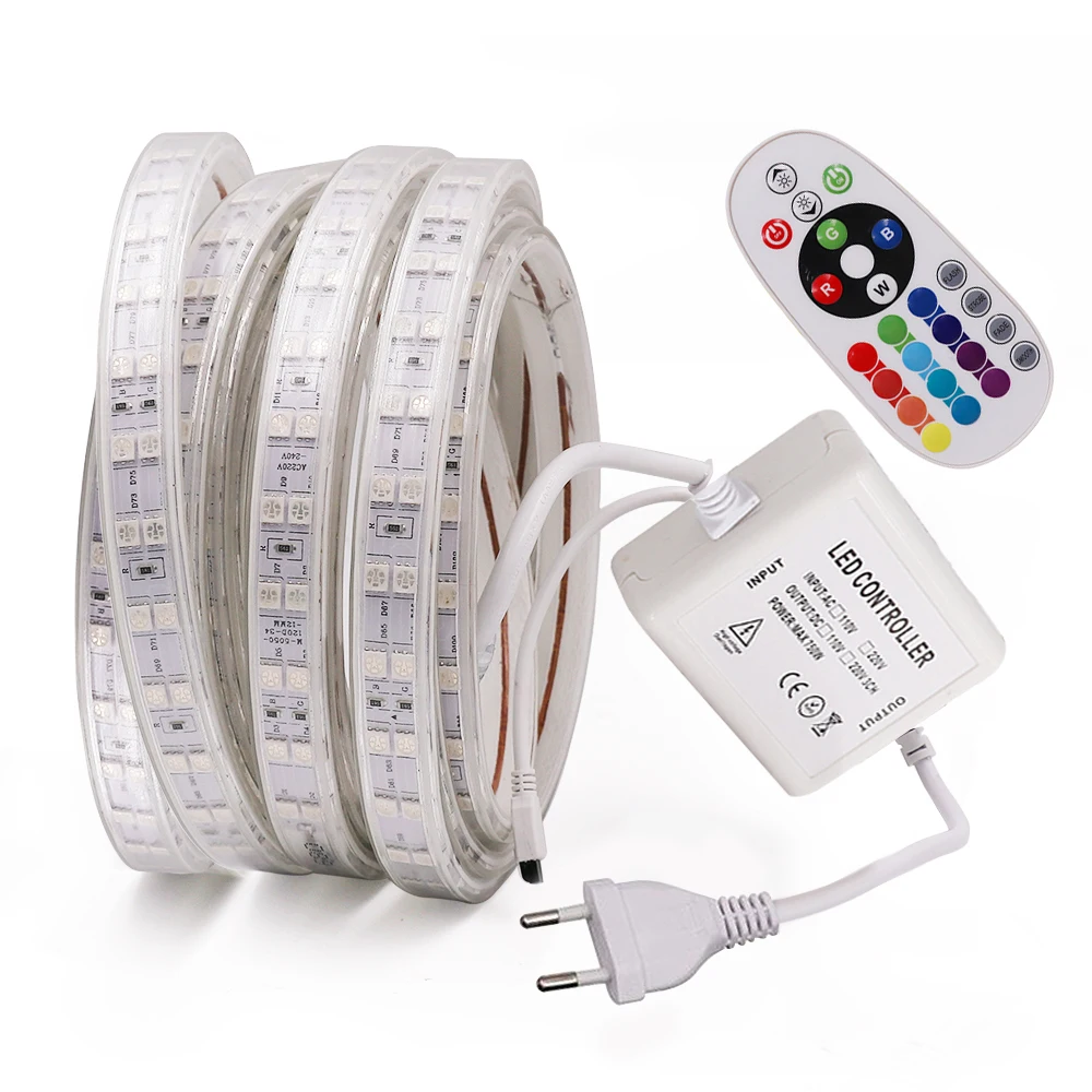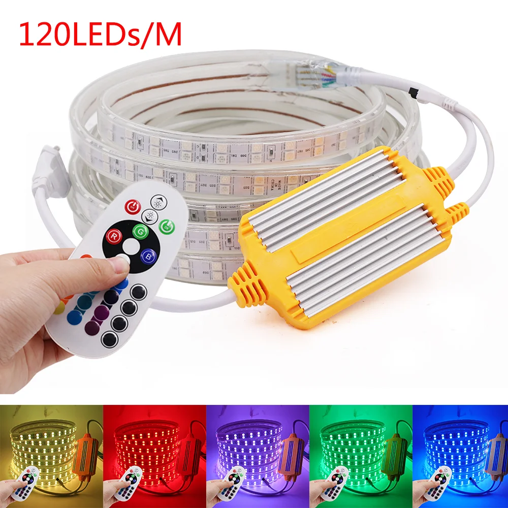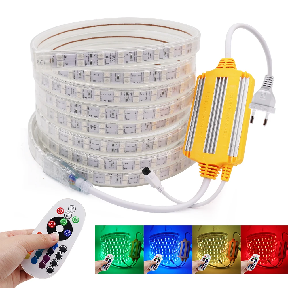 Светодиодная лента 220 В RGB 5050 с водонепроницаемым контроллером RGB 60120 светодиодовм гибкая светодиодная лента для улицы Светодиодная лента высокой яркости e штепсельная вилка европейского стандарта