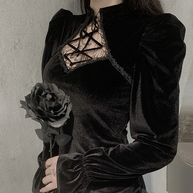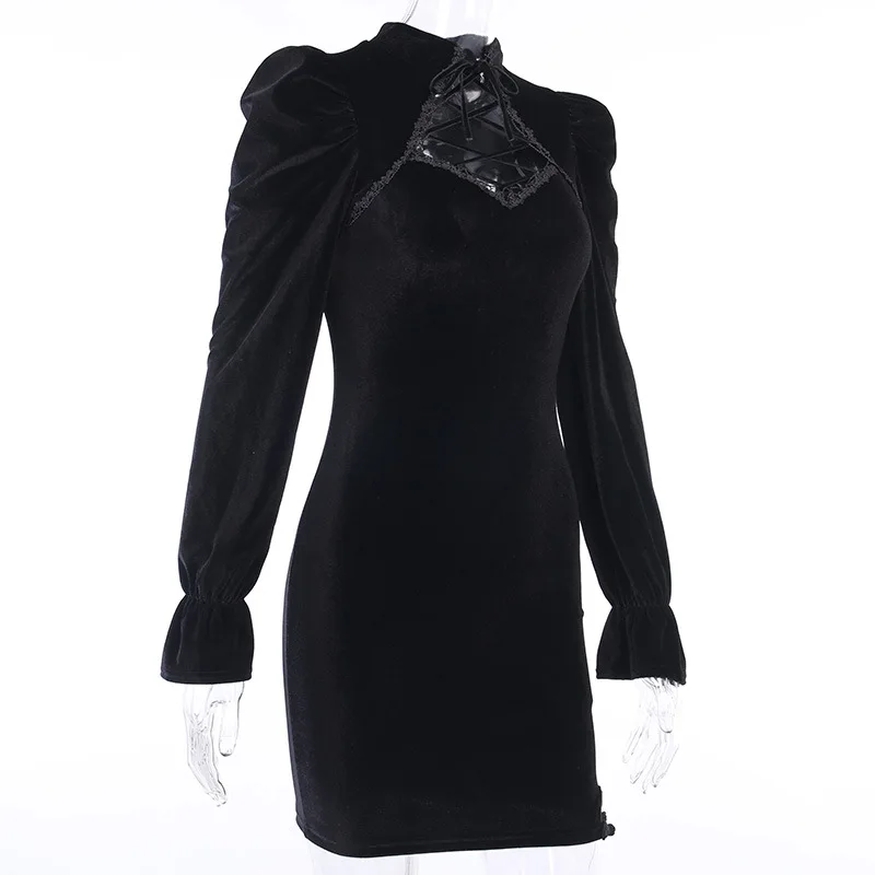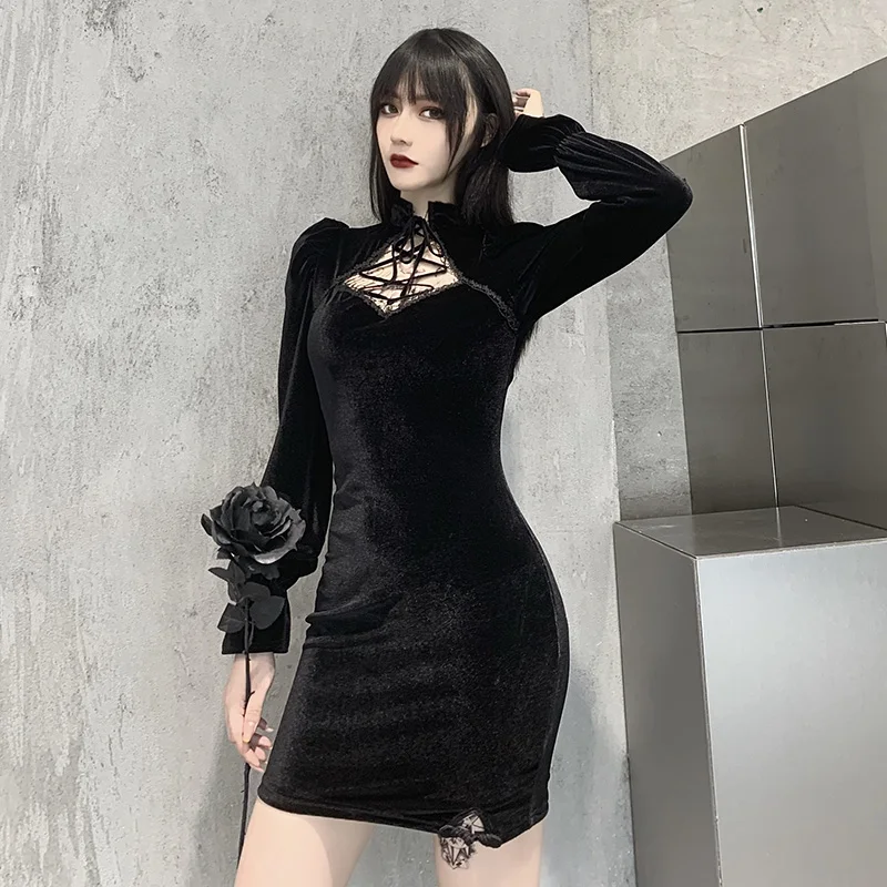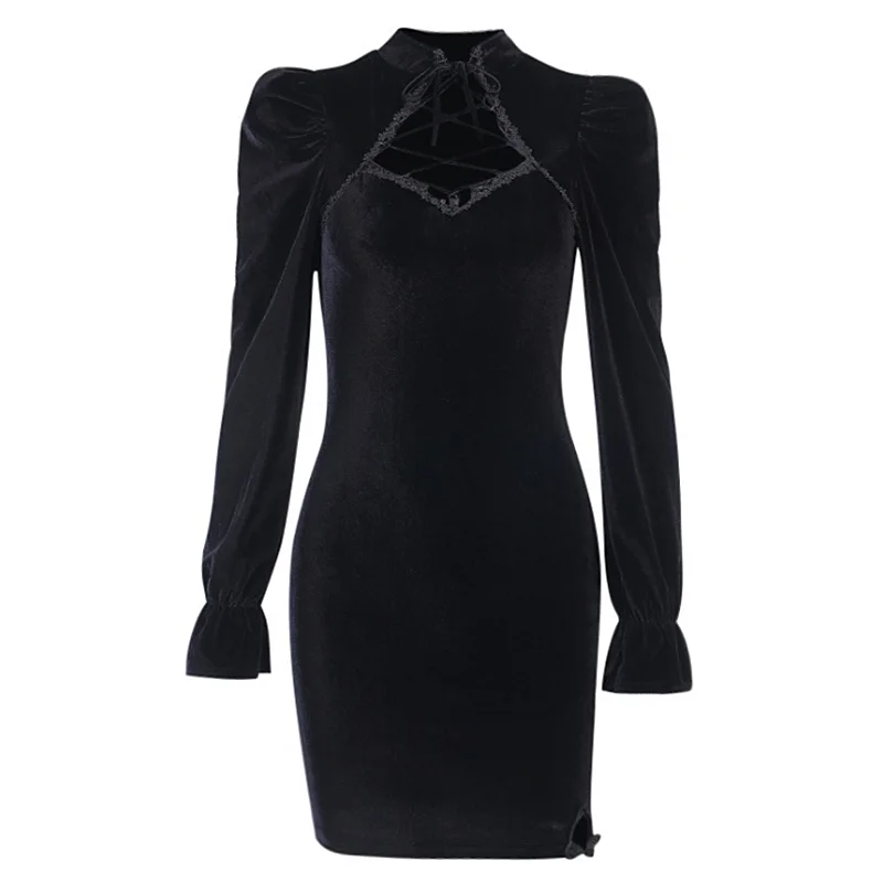 Женское бархатное платье с вырезами, черное облегающее винтажное вечернее банкетное Платье-футляр в готическом стиле, элегантная темная уличная одежда