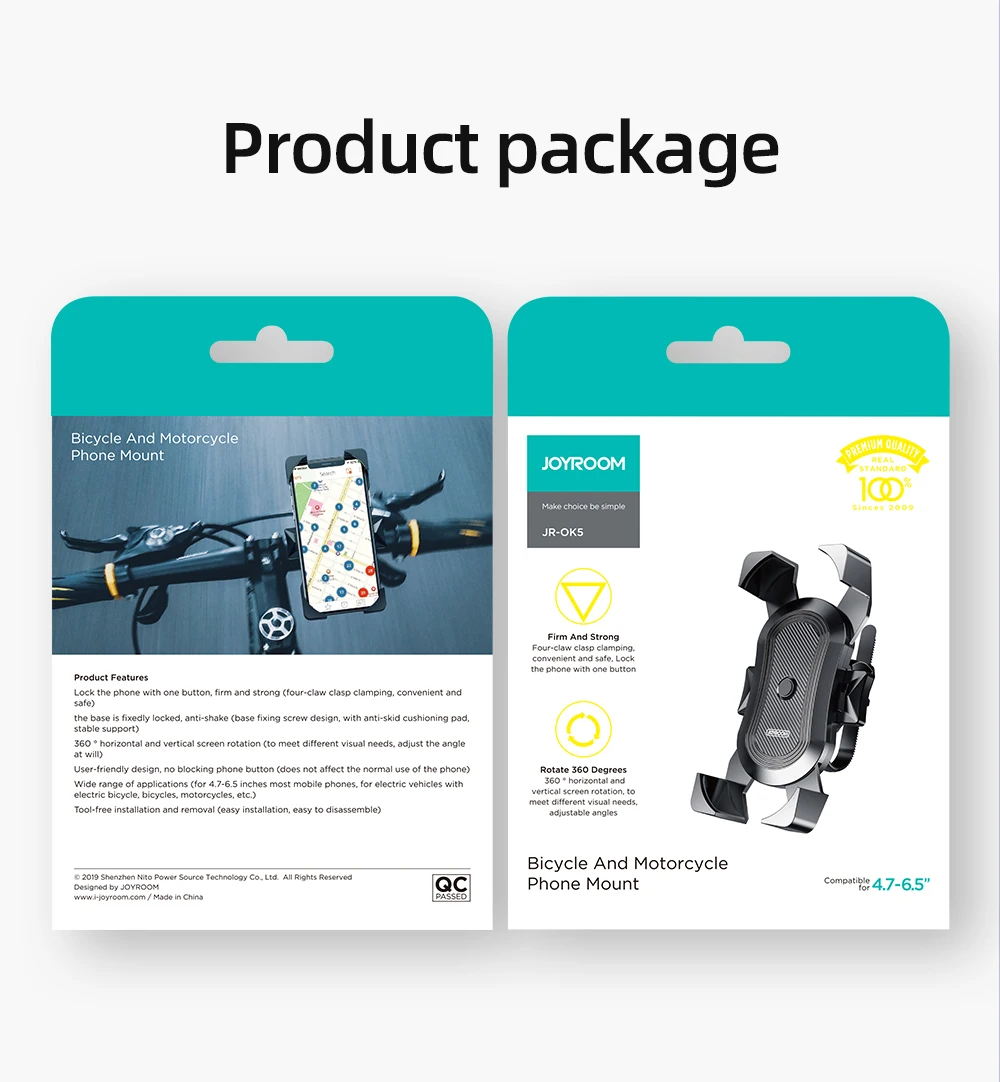НазваниеJoyroom универсальный велосипедный держатель для телефона, безопасный замок и полная защита велосипедный держатель для горного велосипеда мотоцикла для 4-6,8 дюймового смартфонаСпецификация:Модель продукта: JR-OK5Название продукта: кронштейн для ездыЦвет изделия: черныйМатериал изделия: ПК + АБСРазмер продукта: 108*125*83 ммВес нетто продукта: 97,3 гПодать заявку на:1. Велосипед/мотоцикл/электромобиль2. Рекомендуется для руля диаметром 25-35 мм3. Подходит для горных велосипедов, мотоциклетных ручек, подходит для мобильных телефонов, iPhone 11, X/XR/XS MAX, Samsung и большинства 4-6,8 дюймовых смартфоновОсобенности:1.【 одну секунду замок & Release】 4 Угловая руки садится и поймать ваш телефон автоматически, как только вы положите телефон на и нажмите на центральную кнопку. В любое время, когда вы хотите снять телефон, нажмите кнопку релиз для разблокировки. Управление одной рукой, простота в использовании.2. 【Безопасность и полная защита 】joyroom bike держатель сотового телефона разработан с 4 угловыми когтями (с резиновой накладкой внутри, чтобы избежать царапин), не треснет и не сломается при падении. Отображение полного экрана телефона. Не блокируйте функцию Face ID, фронтальную камеру или слайд для разблокировки. Больше бесплатных операций.3.【 вращение на 360 градусов 】крепление для велосипеда Joyroom Совместимо с Горным велосипедом и дорожным велосипедом. Может вращаться на 360 градусов, гарантирует, что ваш телефон будет отображаться под любым углом и в наиболее подходящем положении, которое соответствует вашим предпочтениям4. 【Широкая Совместимость 】совместимость с большинством велосипедных рулей. Велосипедный держатель для телефона надежно подходит для любого сотового телефона с телефонами размер экрана 4-6,8 дюймов: iPhone 11 Pro X XR XS MAX 8 7 6s plus; Samsung Galaxy S8 9 10 plus Edge S7, примечание 8 9, Google Nexus, LG, GPS устройства и многое другое.5. 【Без риска приобретения】с держателем для телефона JOYROOM bike вы также можете закрепить свой телефон на тележке для гольфа, коляске, беговой дорожке, корзине для покупок или в любом месте, если у вас есть круглый бар. По какой-либо причине вам не нравится крепление для телефона на велосипед, просто свяжитесь с нами, и мы вернем каждую копейку или заменим его без каких-либо вопросов360 * градусным вращениемСвободно настраивайте телефон в любое положение