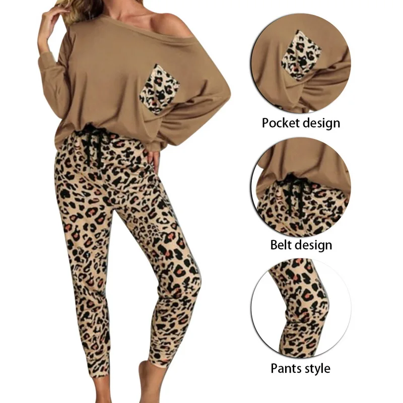 Женский леопардовый домашний пижамный комплект Laamei, Повседневная футболка с завязками, спортивные штаны, пижамный комплект, эластичная одежда для сна, осень 2021