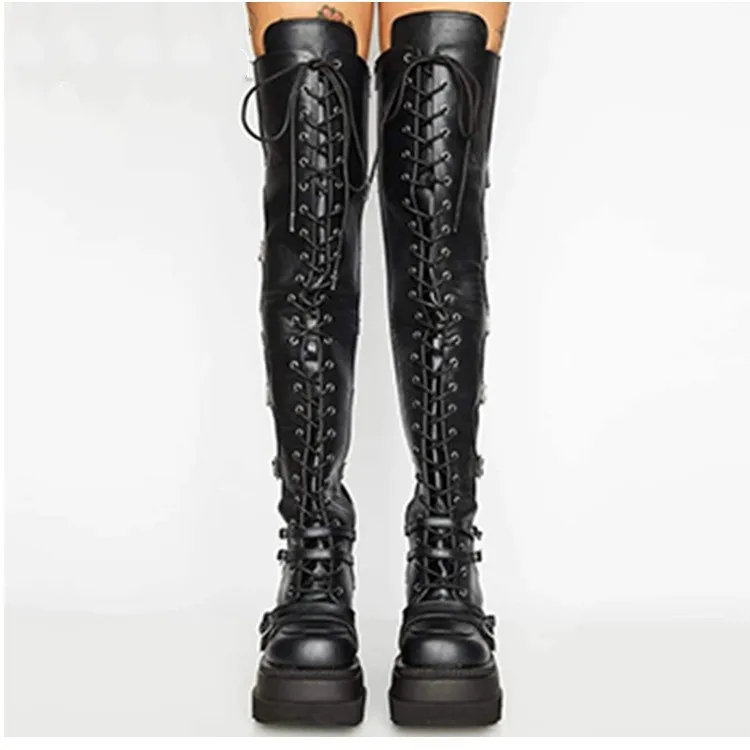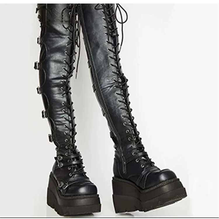 Брендовые дизайнерские шнурки большого размера, мотоциклетные ботинки для косплея, женские ботинки на высокой танкетке, высокие ботинки до бедра, женская обувь
