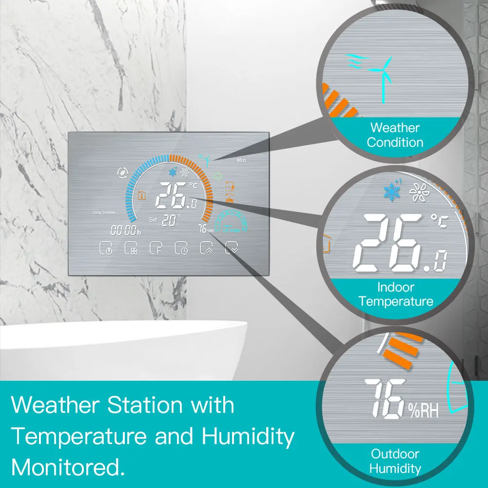 2. Металлическая матовая панель с метеостанцией поддерживается: температура в помещении и уличная Влажность/ультрафиолетовое излучение контролируются и отображаются на ЖК-экране, выдвигаются через 3-4 минуты после подключения, просмотр вашей местной погоды, включая температуру в помещении и уровень относительной влажности на улице, а также состояние ветра. Изумительная серебряная рамка и прямоугольный дисплей Чтобы защитить ваши глаза с четким цифровым дисплеем по Фаренгейту или Цельсию опционально, разработан для простоты использования и подходит для любого стиля комнаты, точность 1 ℃ сохраняет температуру в пределах установленного Вами уровня. (Примечание: отображаемая влажность, погода и ультрафиолетовое излучение предназначены для наружных данных с метеостанции.)