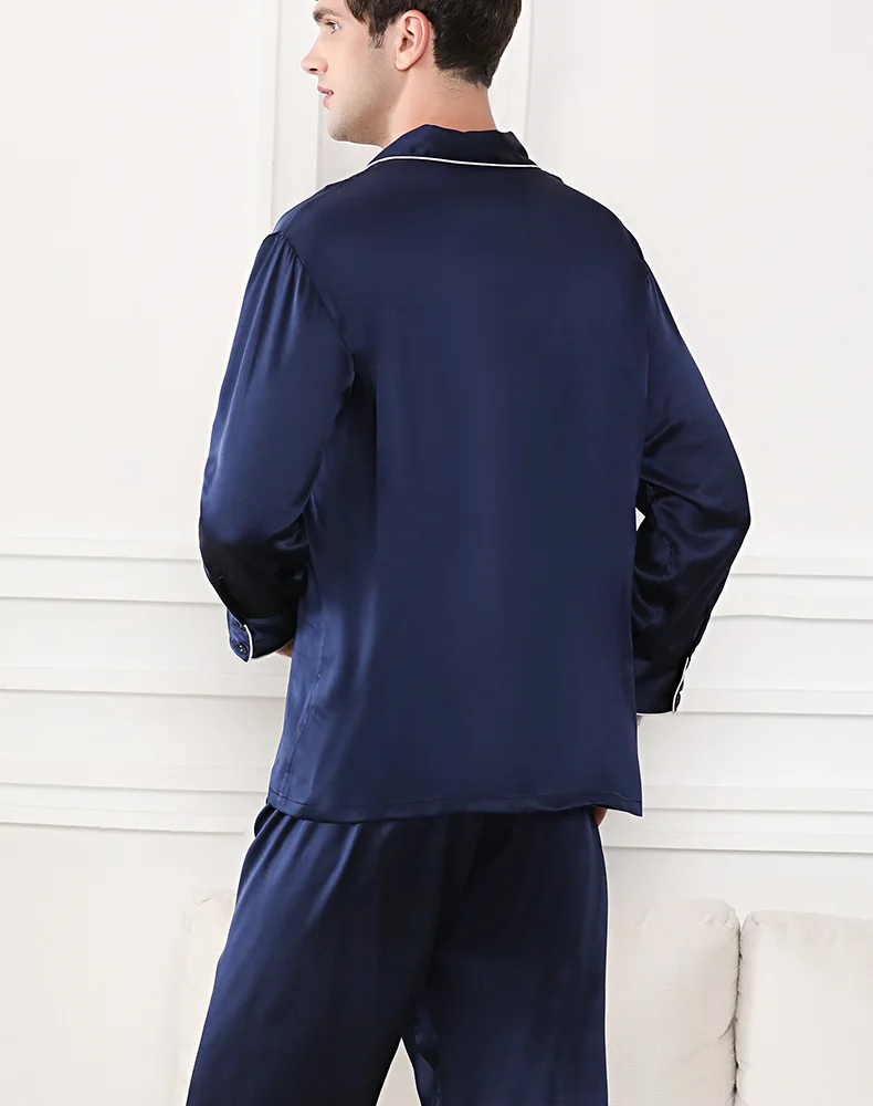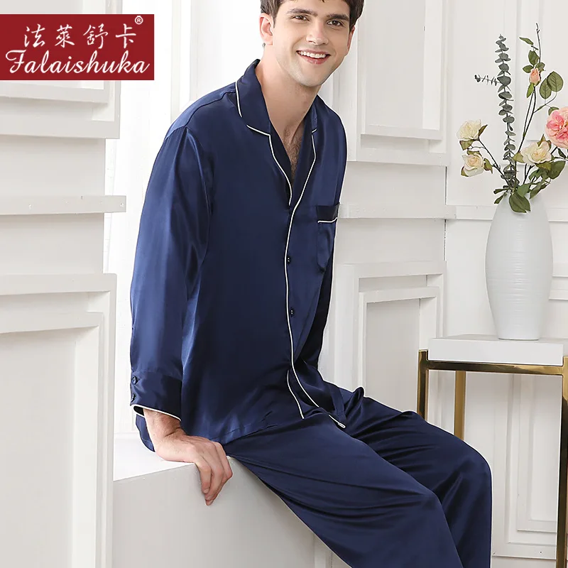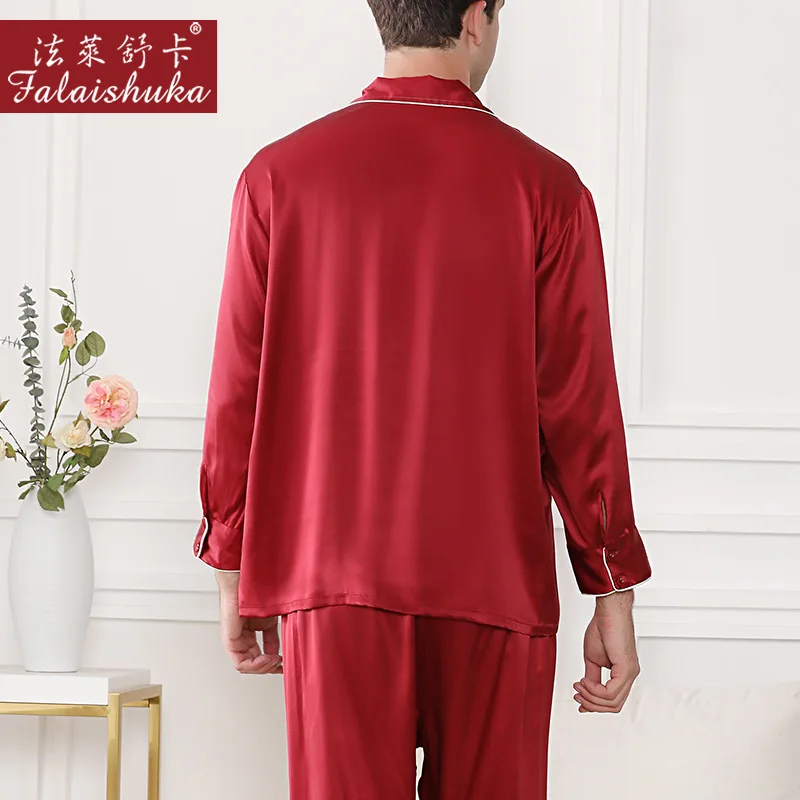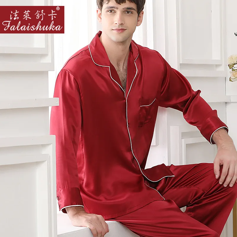 Пижама мужская из 100% шелка, однотонная шелковая рубашка с длинными рукавами, костюм-Двойка для дома, одежда для сна, 19 мм