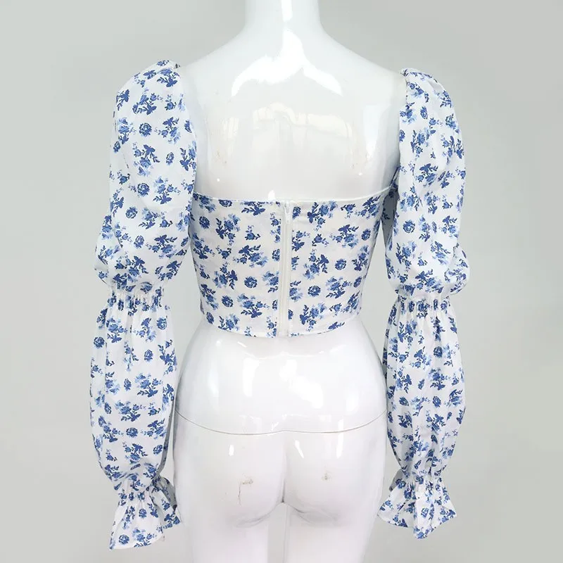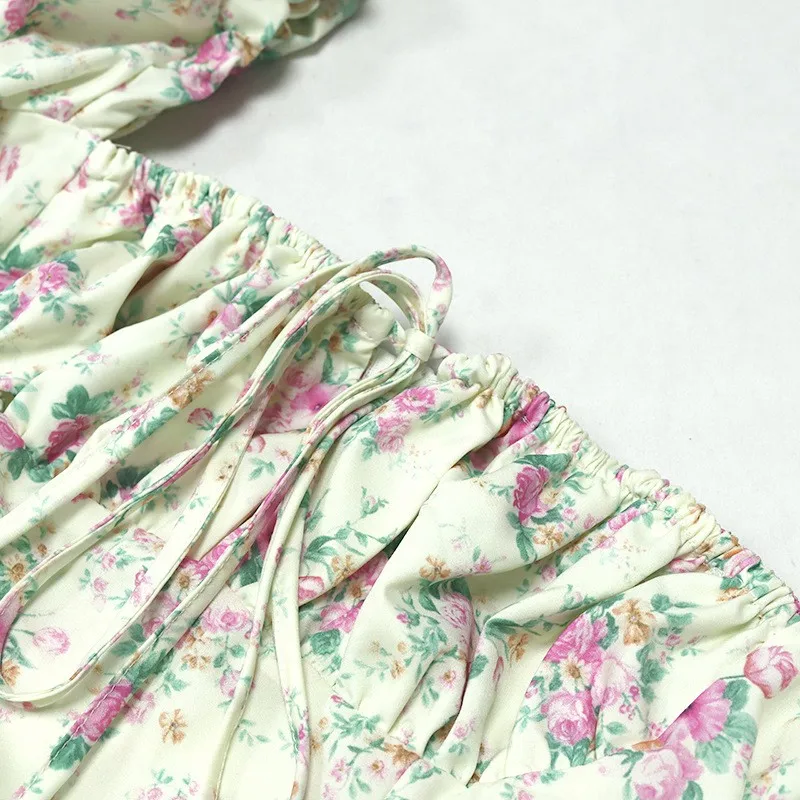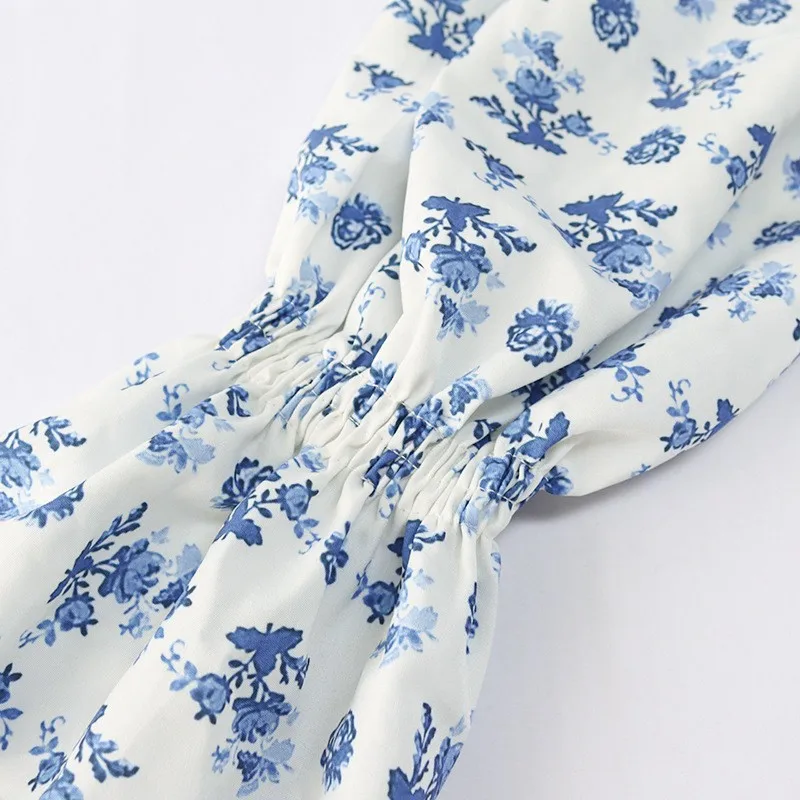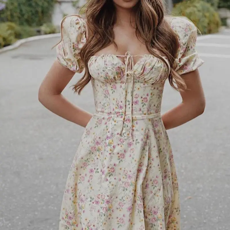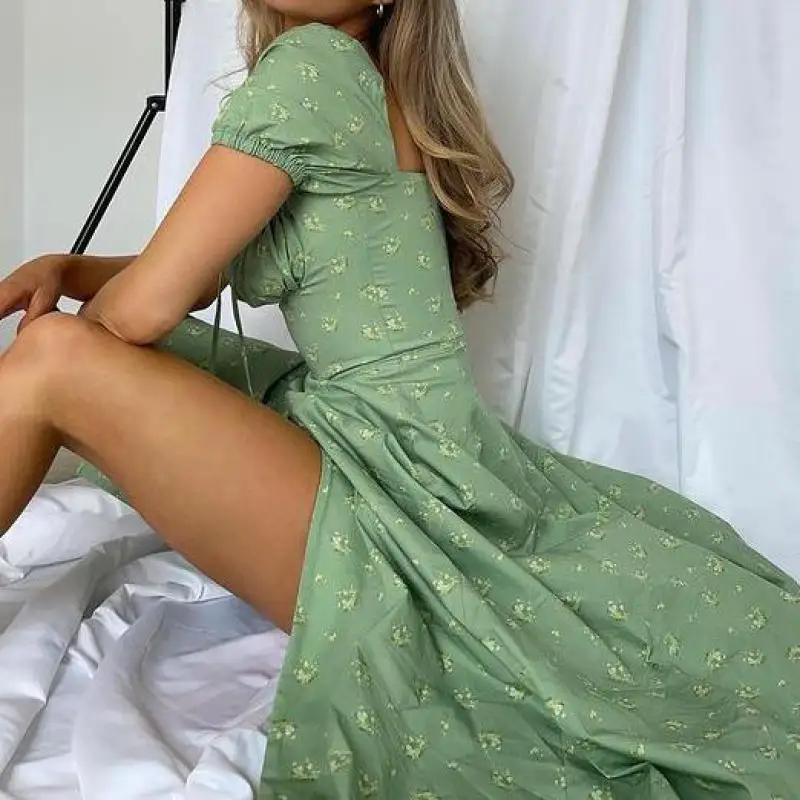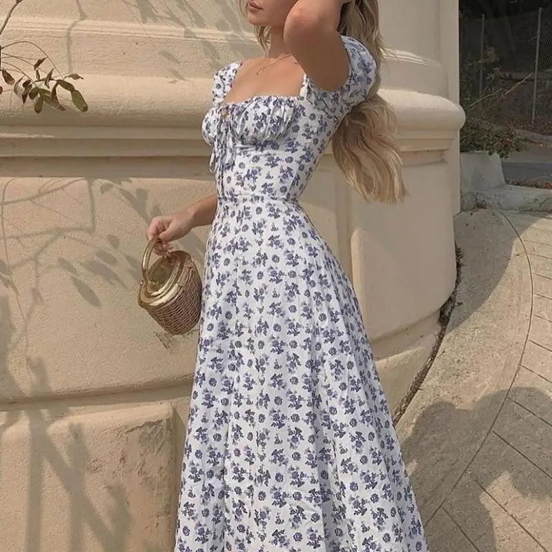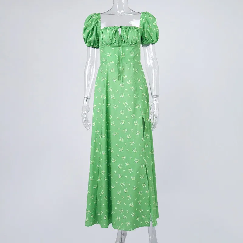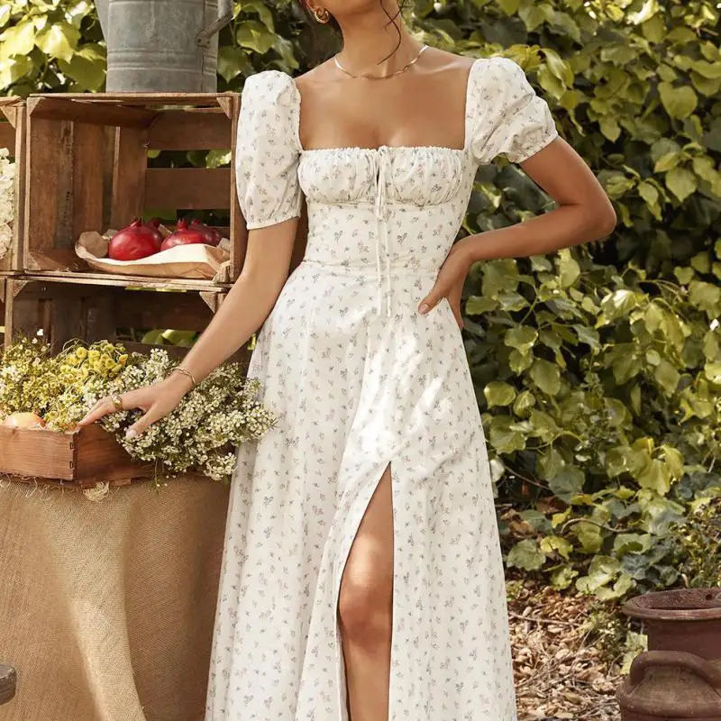 Женское длинное платье на шнуровке, с цветочным принтом, с высоким разрезом и пышными рукавами, винтажный Сарафан Макси из хлопка с квадратным воротником и рюшами на кулиске, лето
