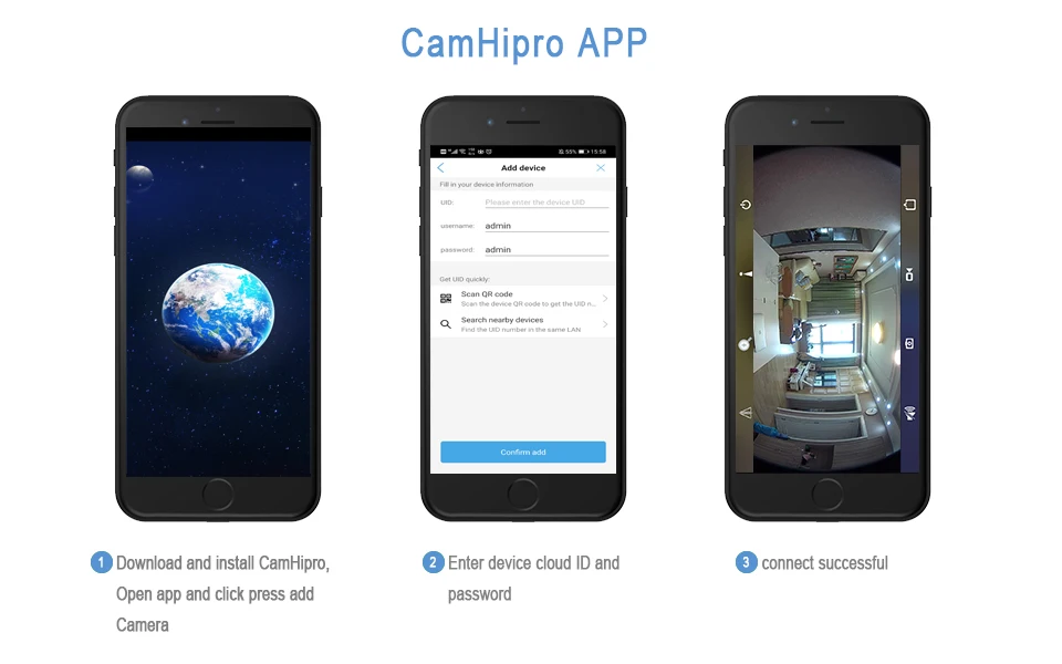 ①Скачать и istall Camhipro. Откройте приложение и нажмите кнопку «добавить камеру».②Введите идентификатор устройства и пароль.③ Подключение успешно.