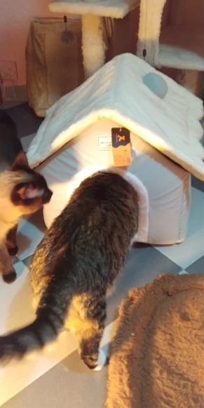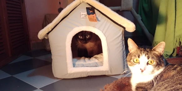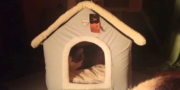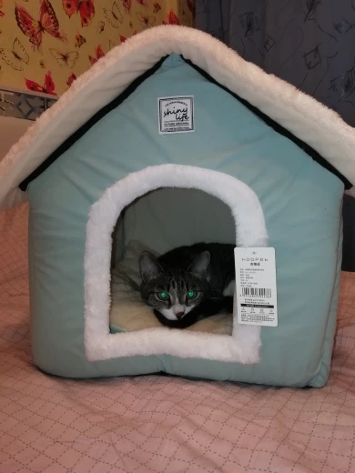 Хороший домик, размер соответствует заявленному, понравилось, то что подушечка разной мягкости и двухцветная) жаль кошка не спит в домике, так нюхает его и ложится рядом) я забрасываю ее любимые игрушки в него, но она их берет и выходит сразу(