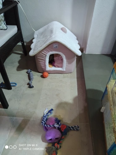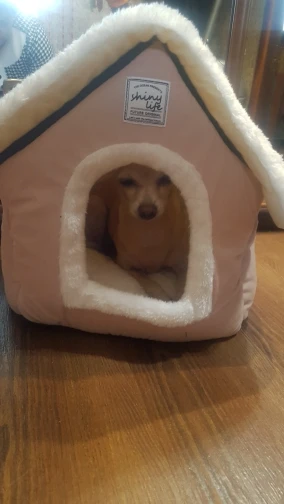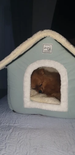 Домик чудесный. Почитав отзывы, заказала для шпица 2 кг самый большой дом. Ему он как раз, и развернуться и улечся