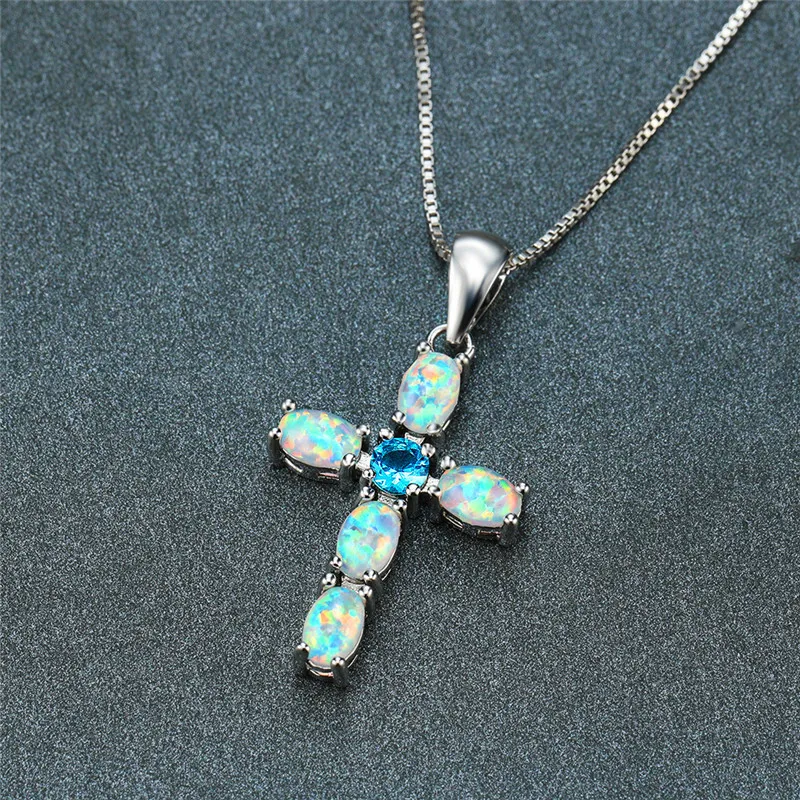 Ожерелье женское винтажное из серебра 925 пробы с подвеской-крестом из белого, зеленого, оранжевого опала и красного, синего циркония