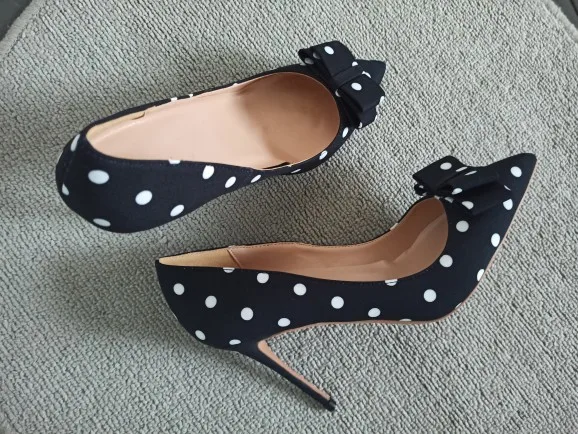 Туфли-лодочки с бантом, черные, в белый горошек, на тонком высоком каблуке 12 см, весенне-летние, с острым носком, слипоны, Большие 45, 10 см, 8 см, BM024 ROVICIYA