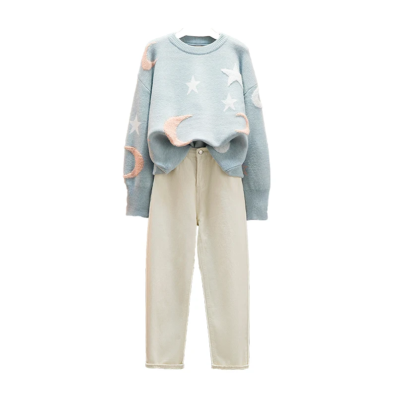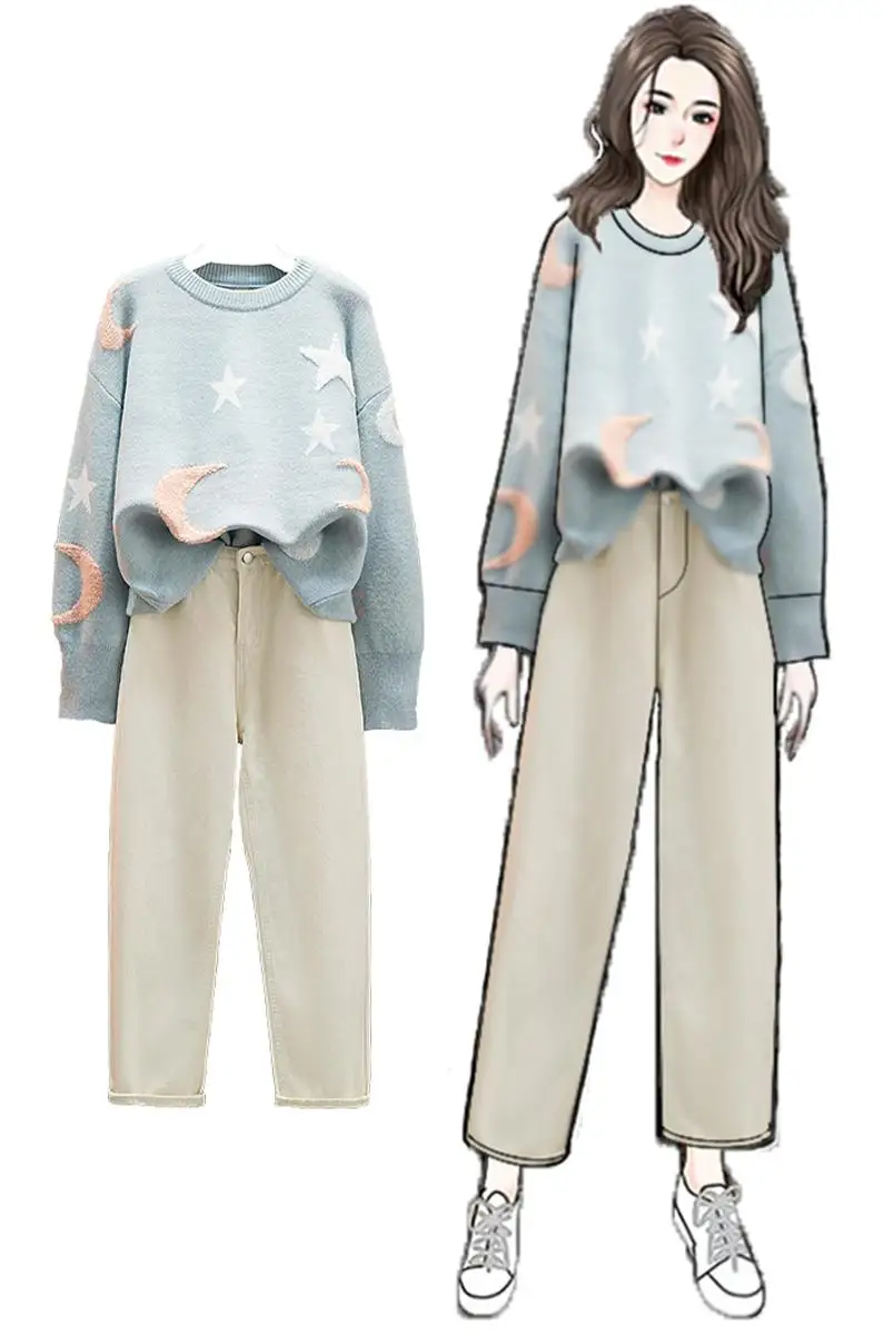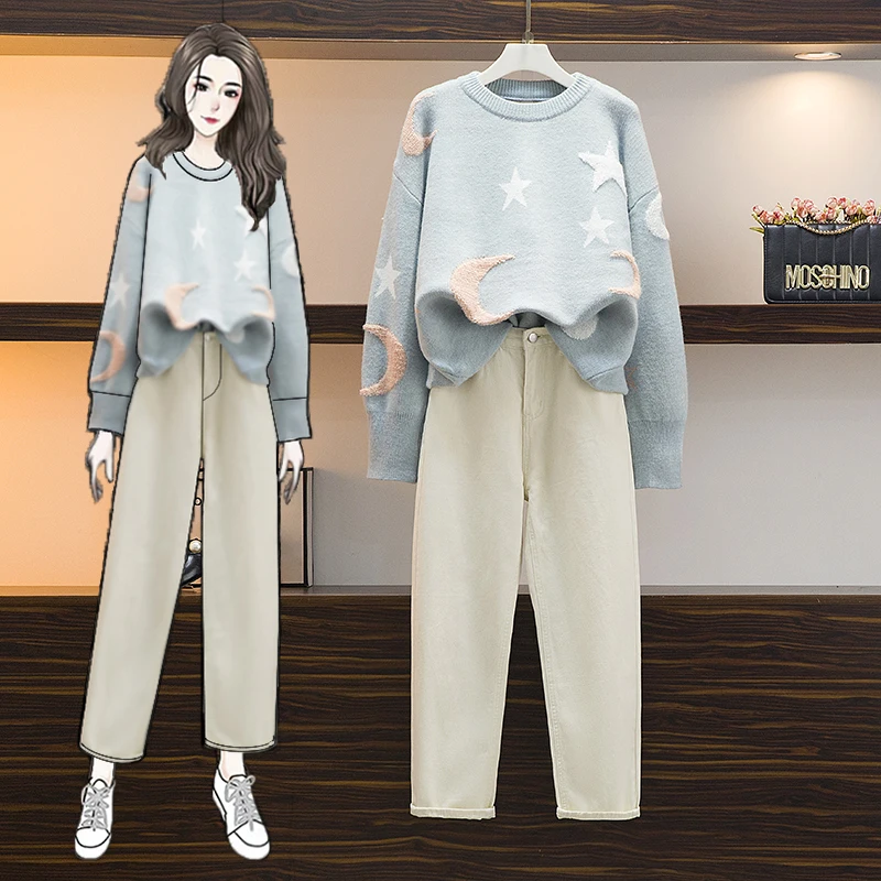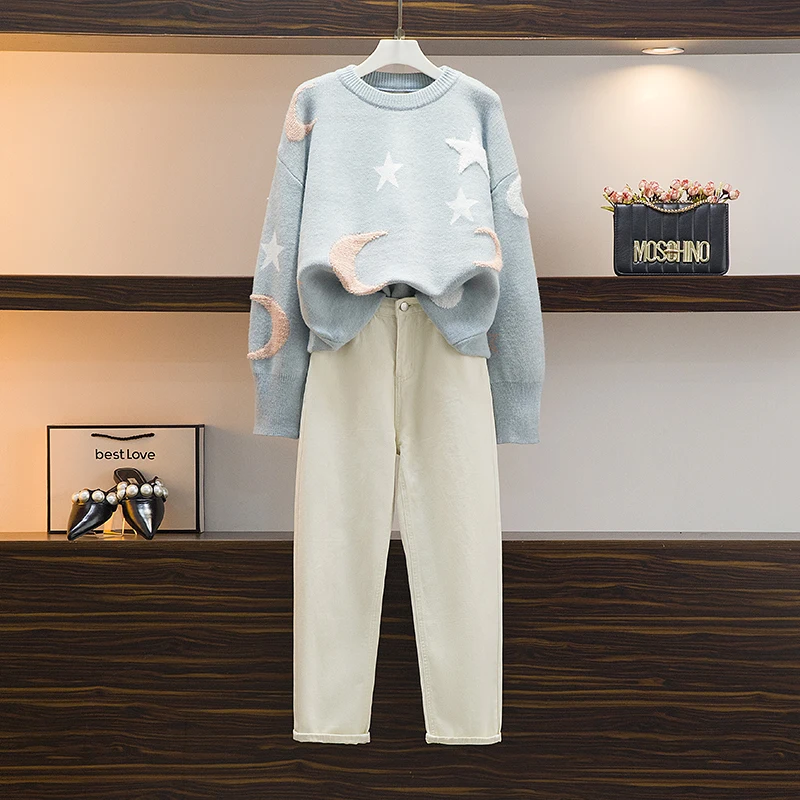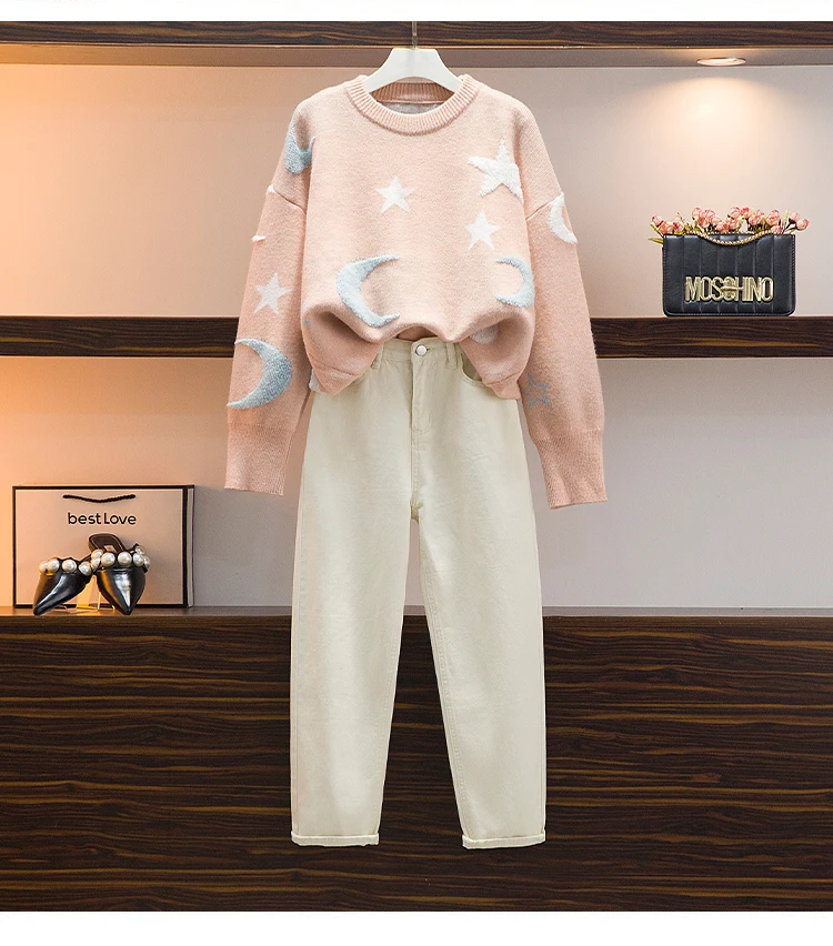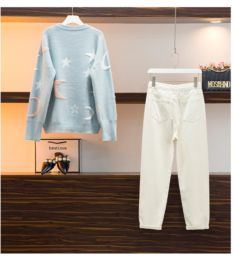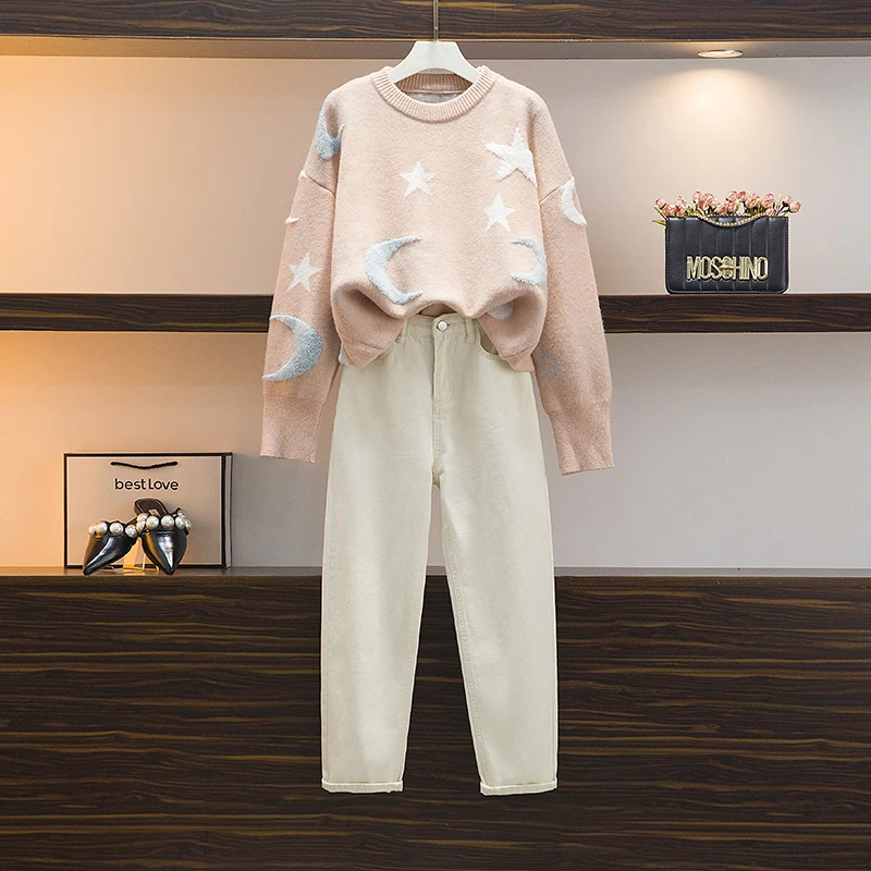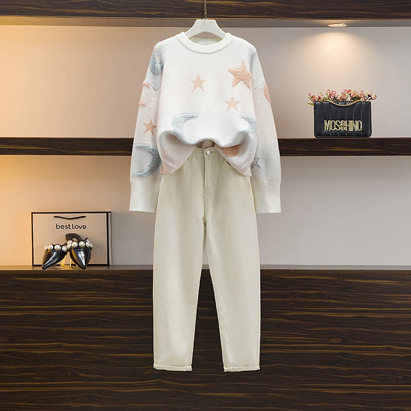 Женский классический костюм, свитер и джинсы, бежевые повседневные комплекты из 2-х предметов, Осень-зима