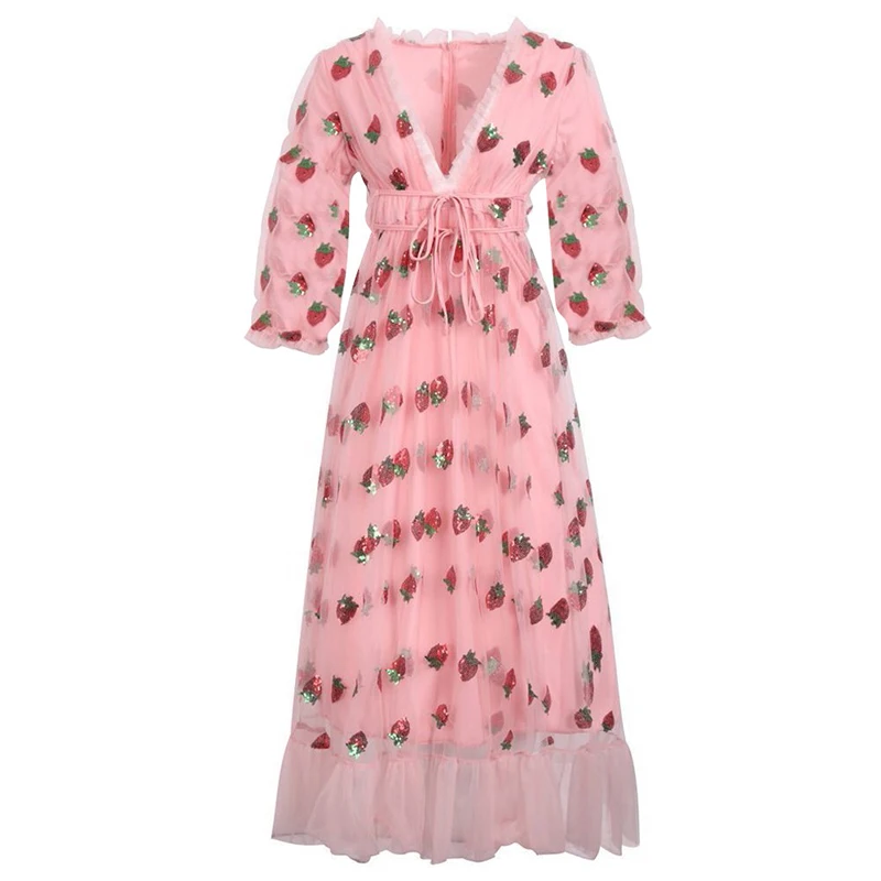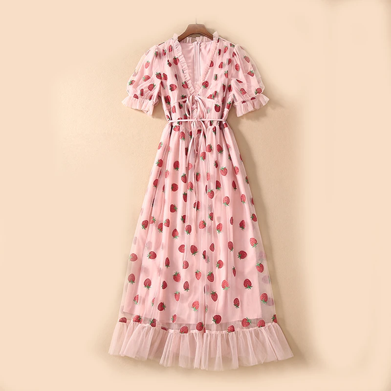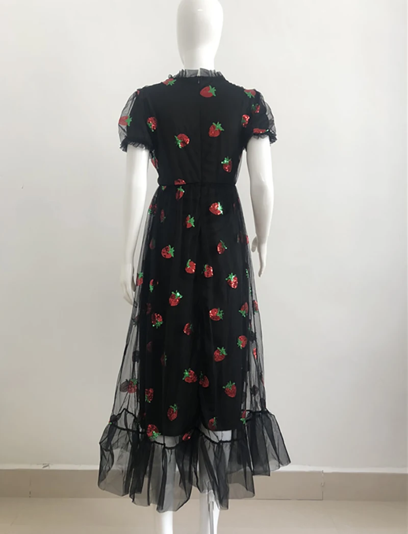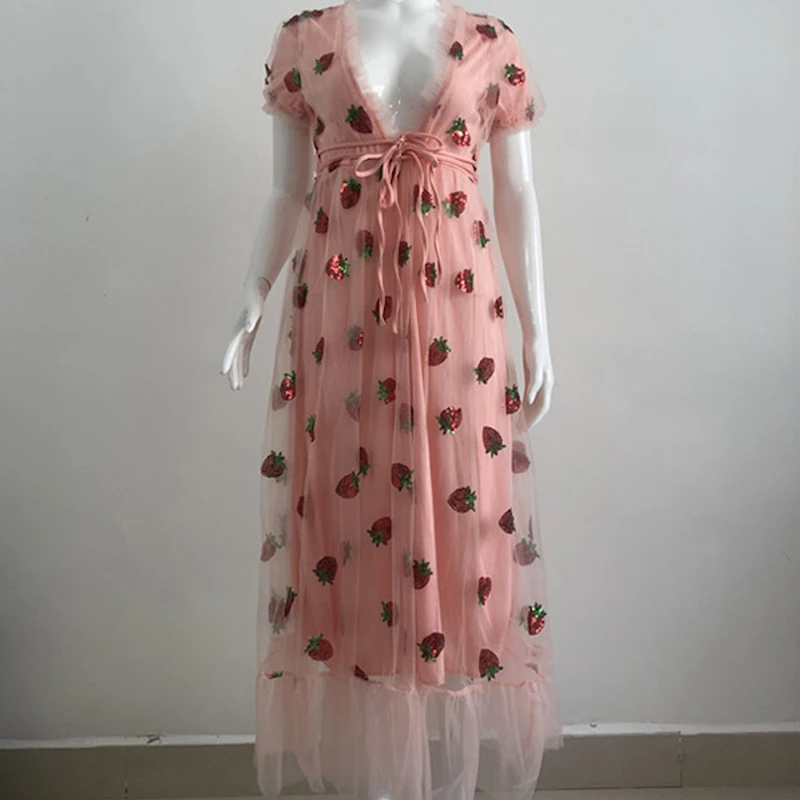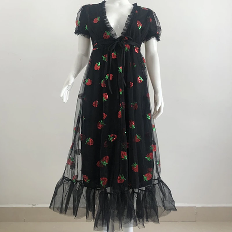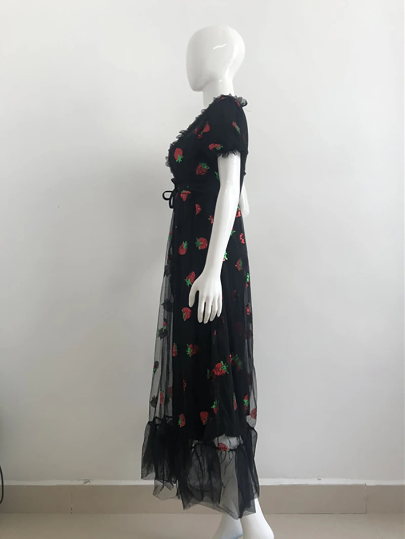 Футболки с короткими рукавами и v-образной горловиной из пряжи и тюля, платье с принтом клубника сексуальные черные розовые середины Длина горячего тиснения элегантное вечернее платье вечерние женская одежда