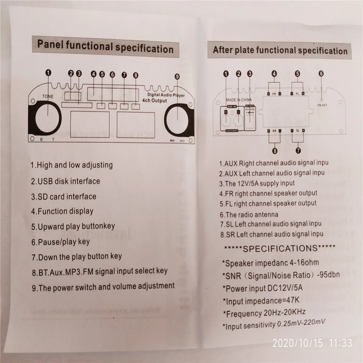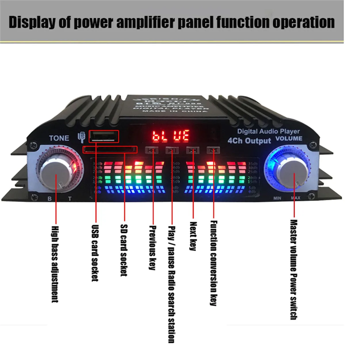 Автомобильный усилитель Bluetooth, 180 Вт x 4, 12 В постоянного тока, Hi-Fi, FM, USB, SD, для сабвуфера, динамиков