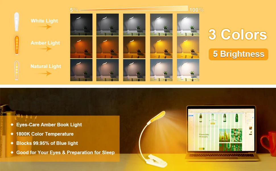 -3 цвета светильник для чтения: янтарный, холодный и смешанный светильник (от 1800 до 6000 К). И выберите различные уровни яркости, чтобы удовлетворить ваши потребности.