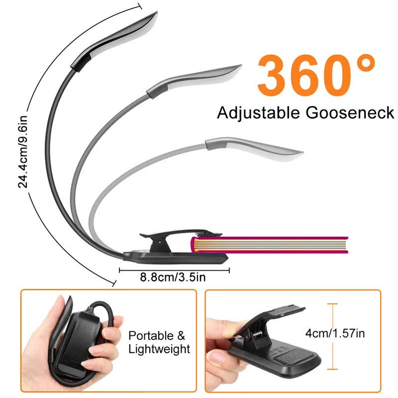 【Гибкая горловина и сверхмощный клип】-светильник на зажиме с вращением на 360 °, можно отрегулировать в любое положение, дать вам много светильник, где бы вы ни находились. Противоскользящая накладка на зажиме обеспечивает лучшую фиксацию и защищает страницы или мебель от повреждений, которые могут быть закреплены на головных платах, ноутбуках, книгах, Kindle и т. д.