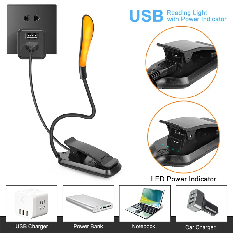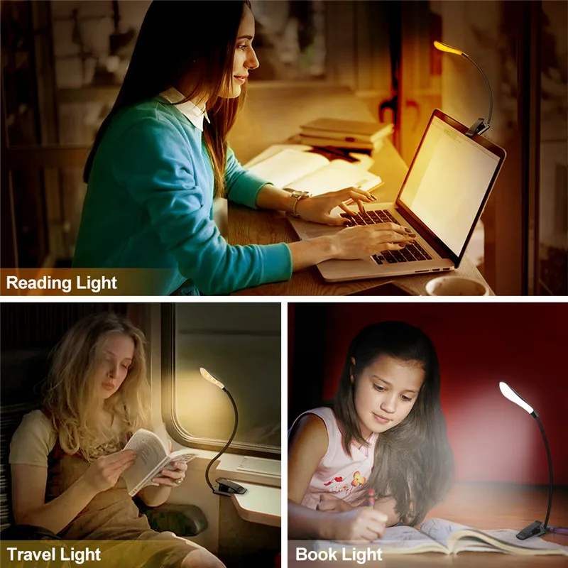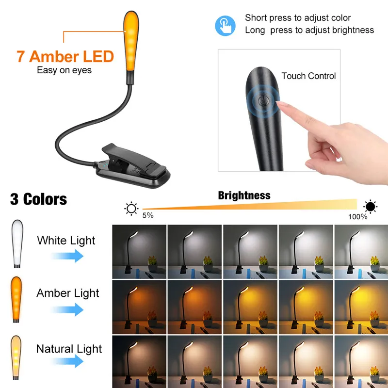 3 режима книга светильник USB Перезаряжаемые гибкий 7 светодиодный зажим для чтения ночной Светильник 5 Яркость Янтарный настольная лампа прикроватный Фонари