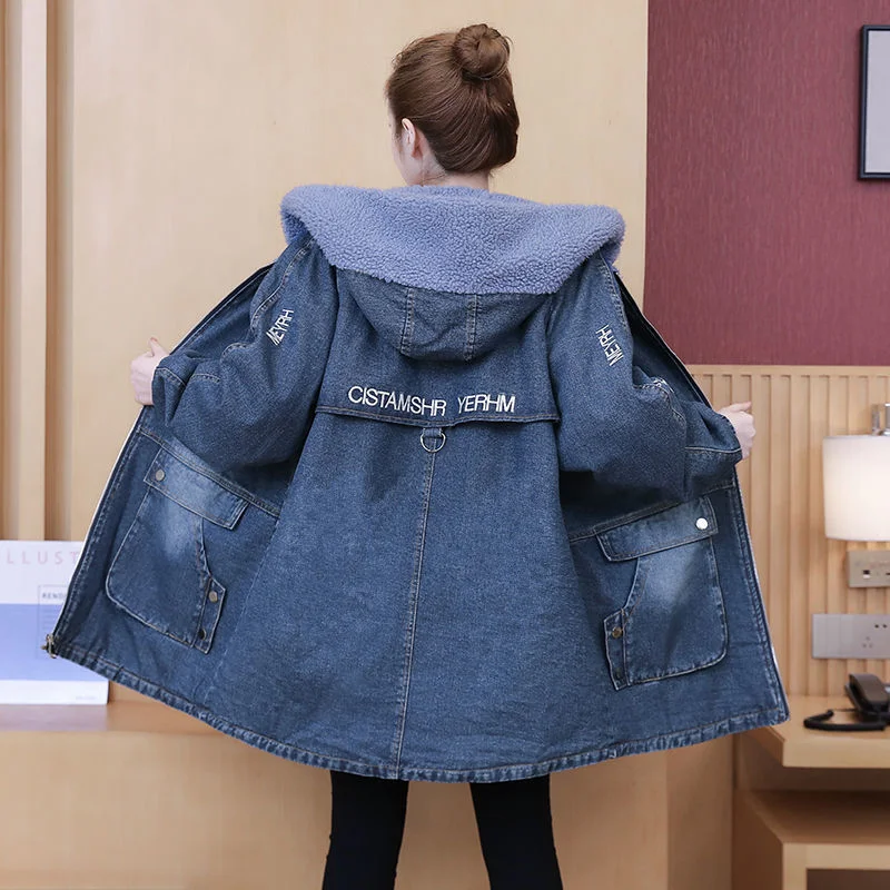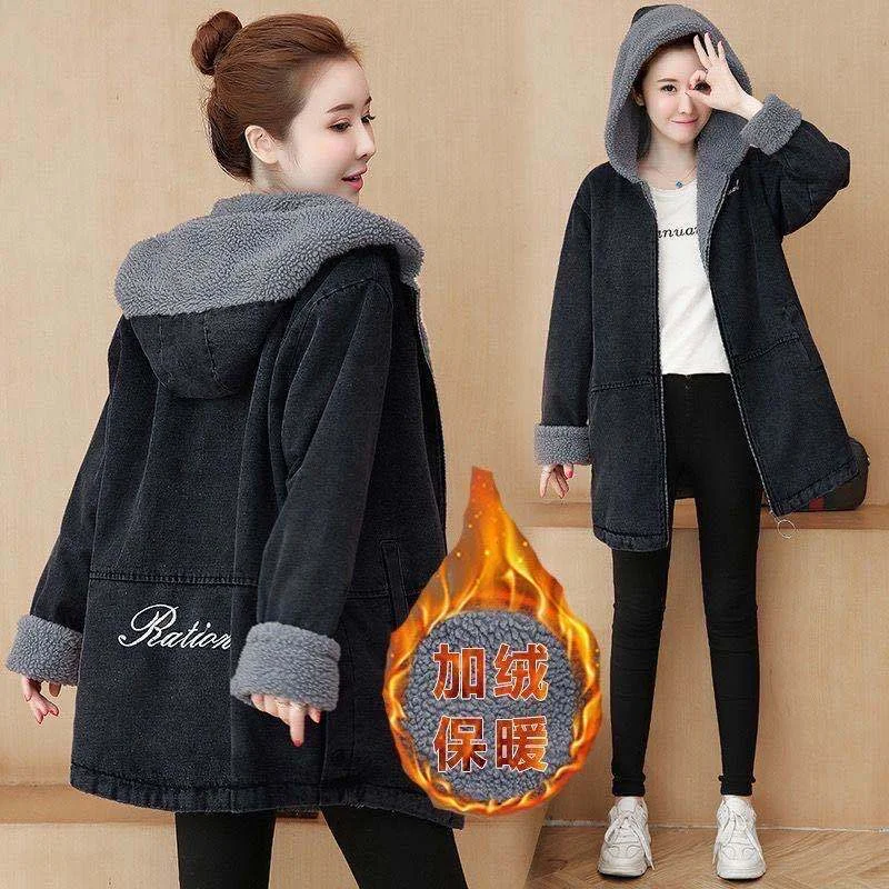Женская утепленная джинсовая куртка из овечьей шерсти, свободная теплая куртка с капюшоном, повседневная Корейская Джинсовая Верхняя одежда, 5XL, H194, зима 2022