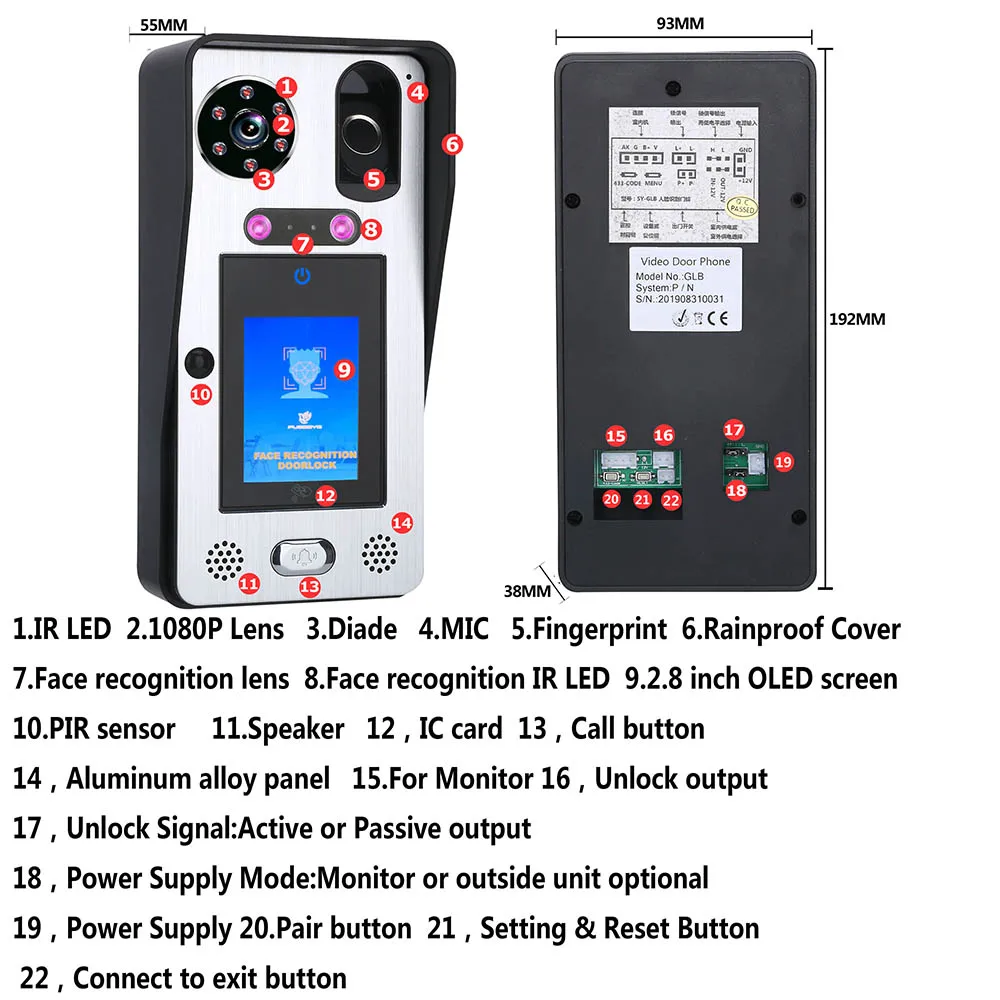 Внешний блок поддерживает распознавание лица 100 шт., отпечатки пальцев 100 шт., отпечатки пальцев 100 шт., Пользовательская Карта IC 100 шт., групповые пароли 100 шт., внутренний монитор и мобильный телефон, разблокировка приложения.