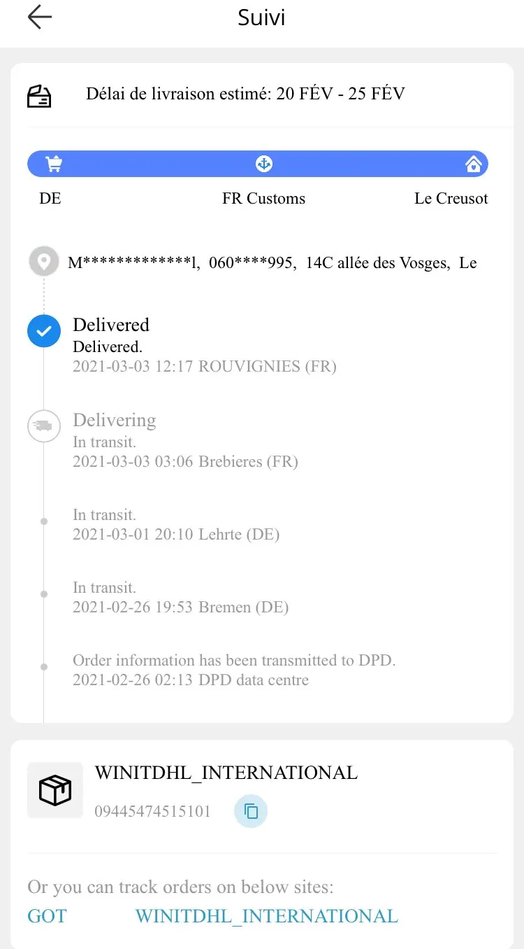 1) продавец отправил мой заказ на неправильный адрес. К сожалению, это может произойти, должно быть, это произошло только один раз в более чем 600 заказах. Но здесь было немного беспорядок, потому что моя посылка выходила из Германии, страны, граничащей с Францией, где я жила, И он не был доставлен мне, когда большую часть времени, когда мои посылки покидают Китай, который находится более чем в 1000 км от моего дома, они всегда прибыли в пункт назначения. Найдите ошибку! 2) Тем не менее, я отправил продавцу сообщение с объяснением в полдень завтра, но он никогда не ответил мне! К сожалению, я пришел в спор на Aliexpress, и после проверки они дали мне полный возврат средств.