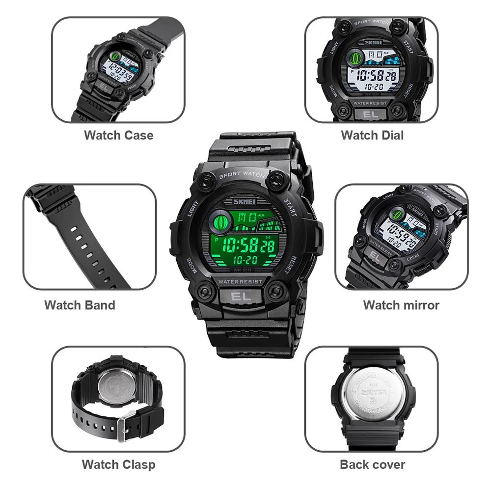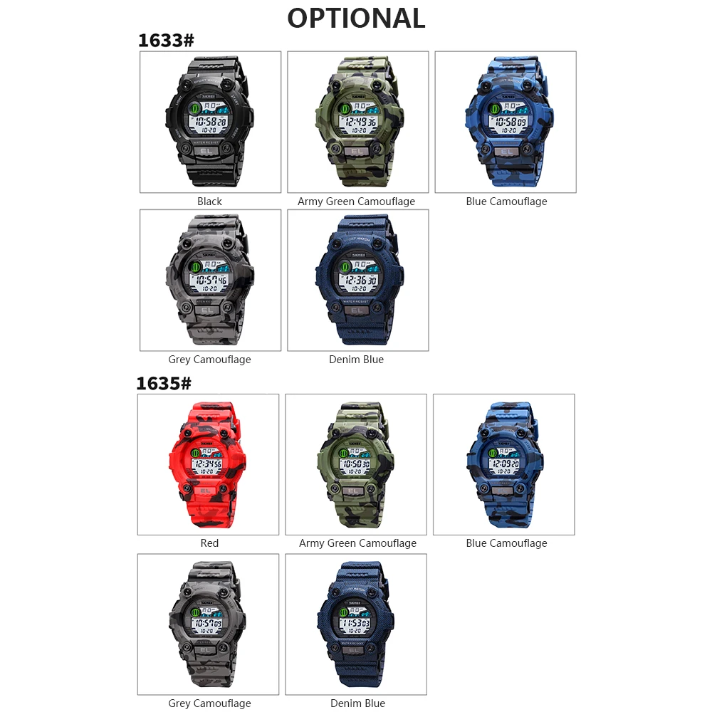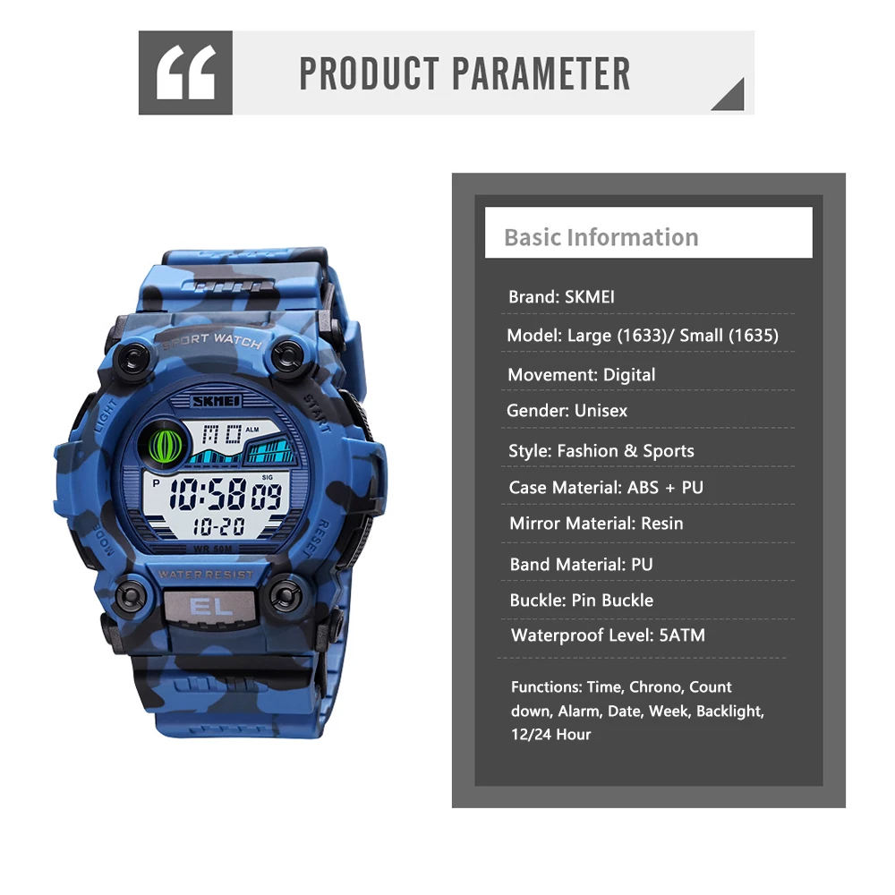 Это модные часы с функциями времени, хронографа, отсчета, будильника, даты, недели и подсветки. Уровень водонепроницаемости 5ATM делает его идеальным для занятий спортом. Большой/маленький размер для опции. Хорошая идея для подарка!Особенности:Модные часы для детей, студентов и подростков, в значительной степени демонстрирующие индивидуальность и энергию.Цифровой механизм обеспечивает более точное Отображение времени. Удобный ремешок для часов подходит для вашей кожи.Функции: время, хронограф, отсчет, будильник, дата, неделя, подсветка, 12/24 часа.Водонепроницаемый уровень 5ATM для ежедневного использования, например мытья рук и лица, попадания под дождь, плавания, не подходит для горячей воды или сауны. Не нажимайте кнопки, когда он находится в воде.Подходит для повседневной жизни или занятий спортом, замечательных подарков на Рождество и фестивали для семьи, друзей и многого другого.Примечание:1. Поддержка ежедневной водонепроницаемости (не подходит для горячей воды или сауны). Не нажимайте кнопки, когда он находится в воде.2. Цвет может немного отличаться из-за различных настроек мониторов и условий освещения. Пожалуйста, будьте добры, спасибо.3. Замеры сделаны вручную, поэтому возможны отклонения на 1-3 мм.Характеристики:Размер (Модель): большой (1633)/маленький (1635) -на выборЦвет:Большой: черный/армейский зеленый камуфляж/синий камуфляж/серый камуфляж/джинсовый синий (дополнительно)Маленький: красный/армейский зеленый камуфляж/синий камуфляж/серый камуфляж/джинсовый синий (дополнительно)Бренд: SKMEIМеханизм: ЦифровойПол: унисексСтиль: мода и спортМатериал корпуса: ABS + PUМатериал зеркала: смолаМатериал ремешка: полиуретанПряжка: ПряжкаУровень водонепроницаемости: 5 атмАккумулятор: CR2025Размер Чехла: большой 52*49*16 мм/2,0*1,9 * 0.6in, маленький 44*42*15 мм/1,7*1,7 * 0.6inДлина Часов: большая 255 мм/10,0 дюйма, маленькая 235 мм/9,3 дюймаВес часов: Большой 58 г/2,0 унции, маленький 40 г/1,4 унцииПосылка: 12*6*4 см/4,7*2,4 * 1.6inВес посылка: большой 64 г/2,3 унции, маленький 46 г/1,6 унцииКомплектация:1 * часы