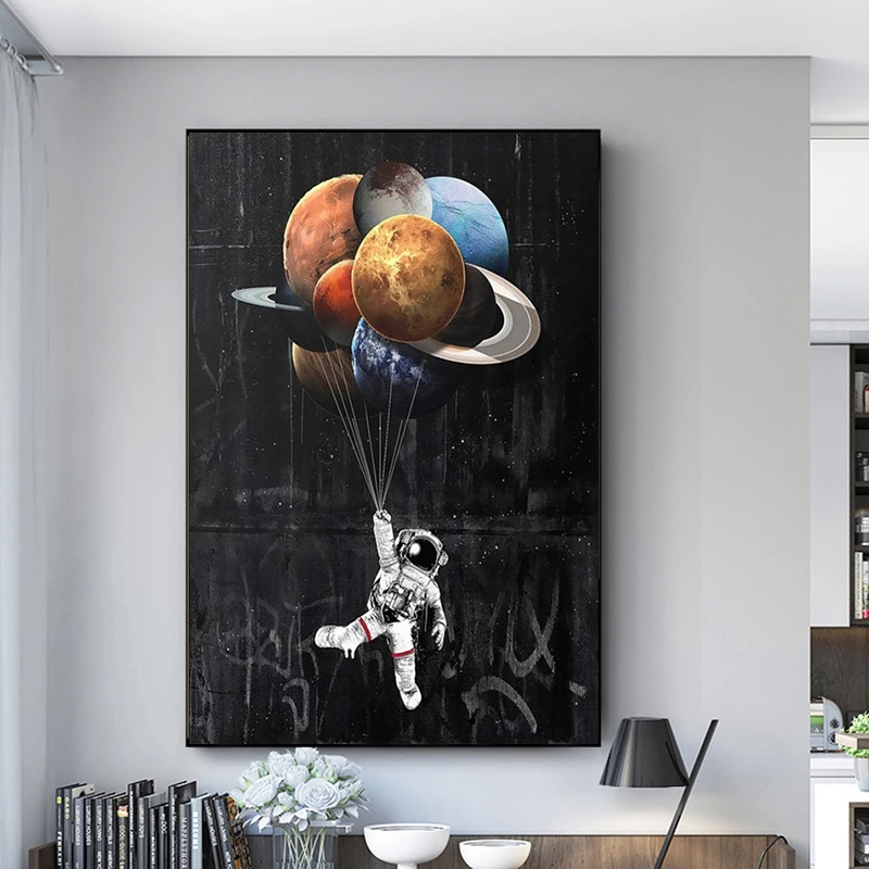 Современное искусство, одинокий астронавт, сидящий в космосе, холст...